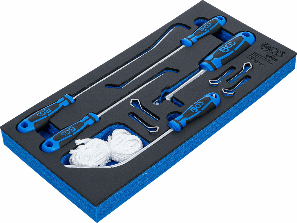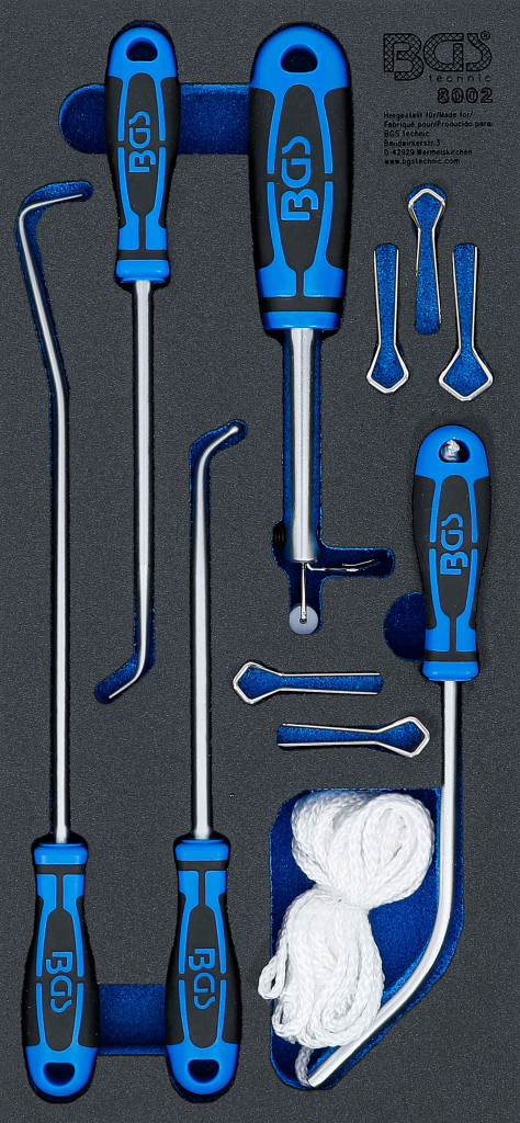Set orodij za vgradnjo vetrobranskih stekel s klasičnim gumijastim tesnilom, vsebuje več različnih ročajev, kljuke in vrvico dolžine 6 m.