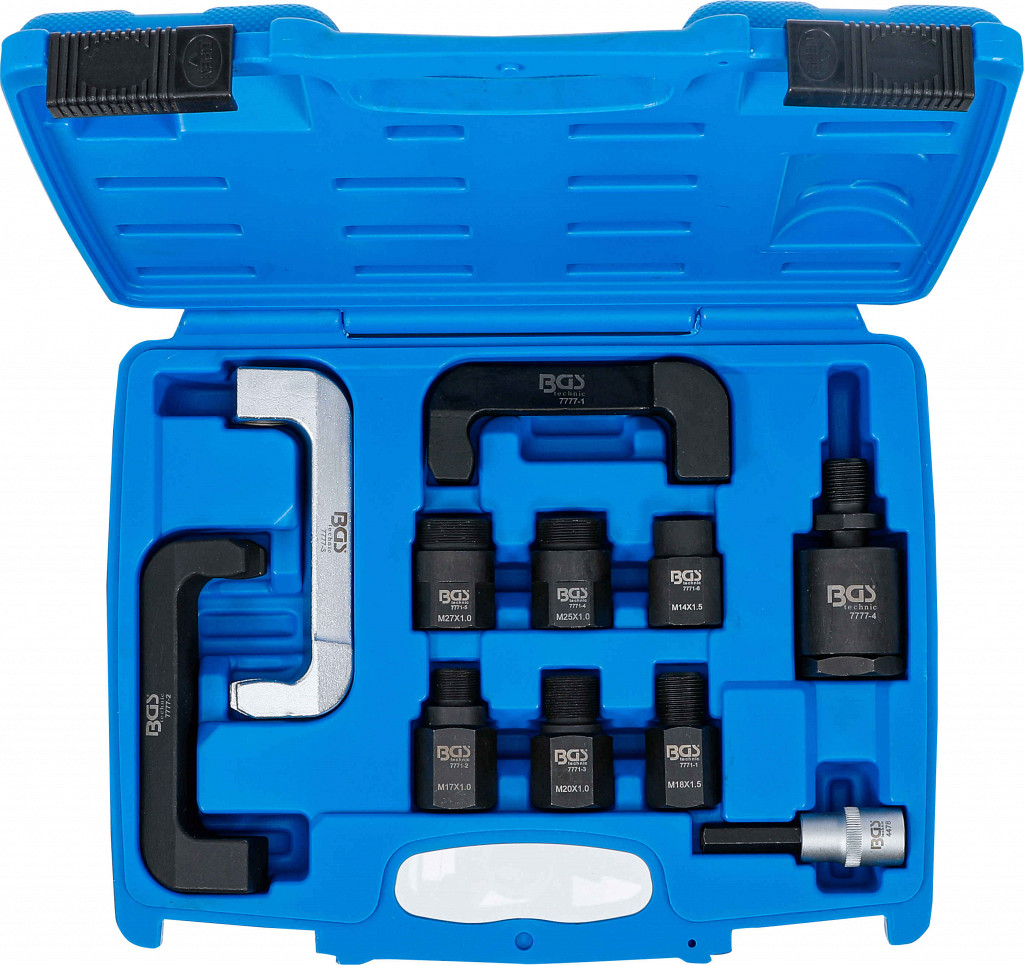 Komplet za snemanje težko odstranljivih dizelskih injektorjev, z adapterji M14–M27, tremi snemalnimi kremplji različnih širin, adapterjem z okroglo glavo in 10 mm nasadnim ključem za šobe.