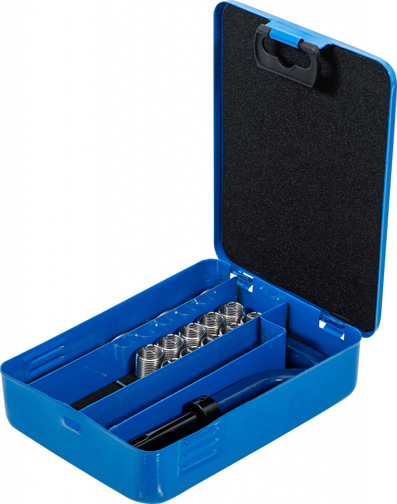 Vsebuje navojne svedre HSS-G, spiralne svedre HSS-G, posebno orodje za vgradnjo, lomilce nastavkov, navojne vložke in je shranjeno v kovčku iz trdne kovine.