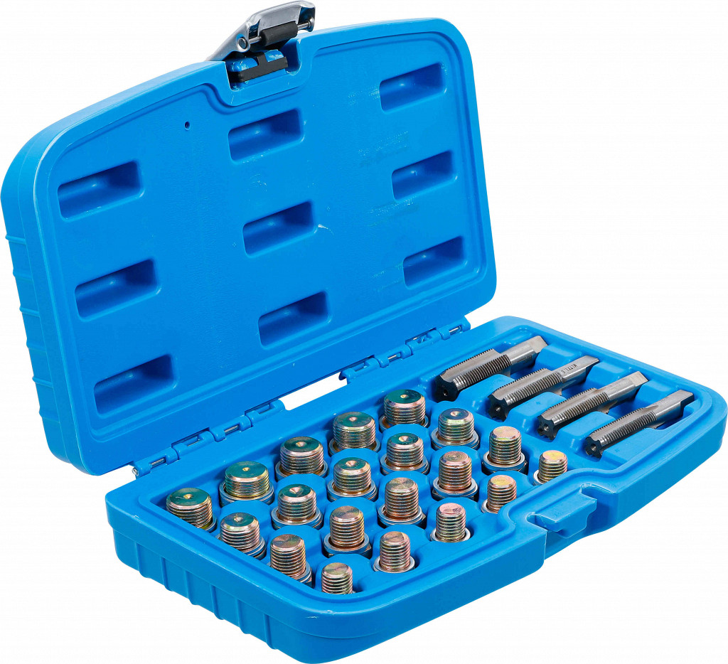 Vsebina: 4 svedra za navoje M13×1,5; M15×1,5; M17×1,5; M20×1,5; po 5 iztočnih čepov za olje M13×1,5 (zunanji šestrob 17 mm), M15×1,5 (zunanji šestrob 19 mm),...