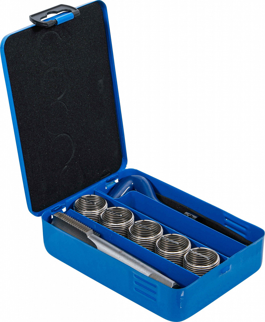 HSS-G navojni set s posebnim montažnim orodjem in 5 navojnimi vložki v kovinskem kovčku.