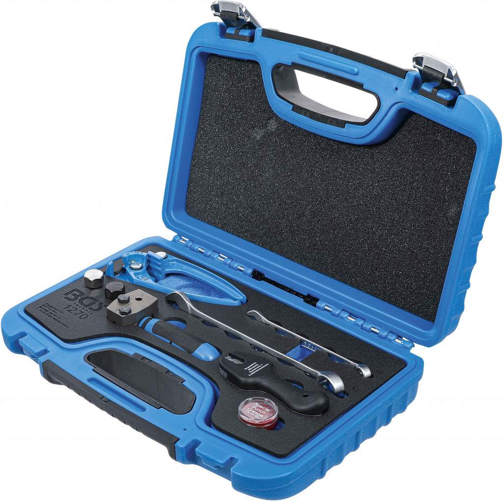 Uporabno tudi na že montiranih zavornih ceveh; primerno za zavorne cevi iz bakra, aluminija in jekla; orodje za razflare 4,75 mm (3/16") po DIN F; raglja rezalnik za cevi 4,75 mm (3/16"), reže brez popolnega obračanja okoli cevi; upogibalec cevi za premere 3 mm, 4,75 mm in 6 mm; vsebina: razflarec z dvokomponentnim ročajem; omejitveni vijak; razflarevni vijak; mazivo; raglja rezalnik zavornih cevi (BGS 8339); upogibalec cevi (BGS 8228); kombinirani ključ 10 mm (BGS 30560); kombinirani ključ 17 mm (BGS 30567).