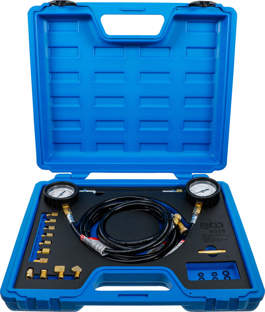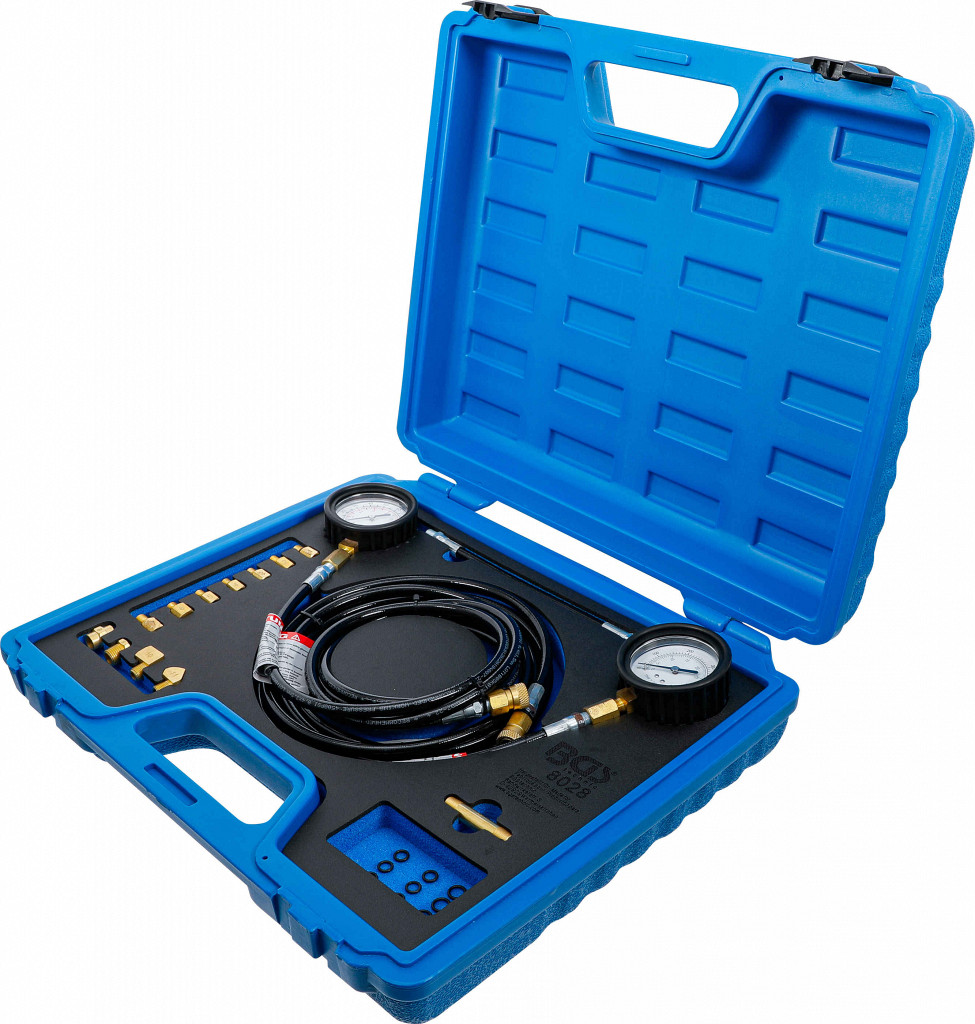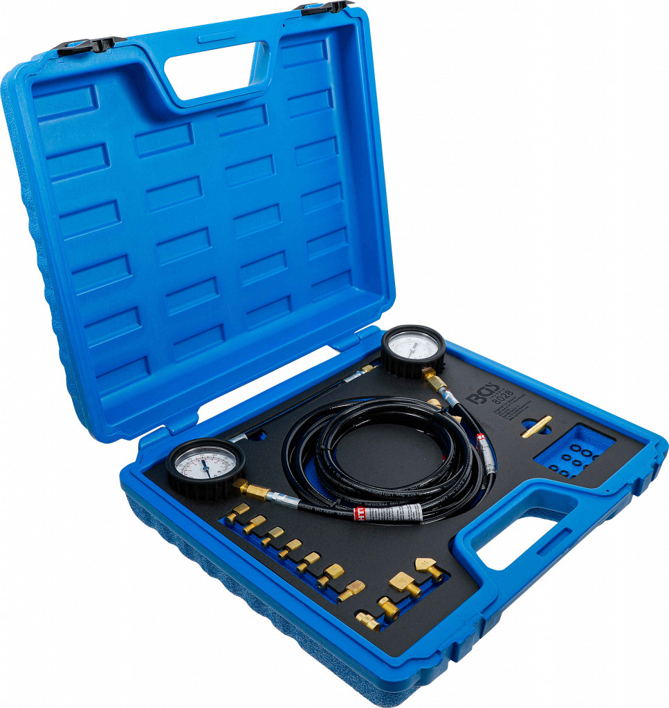 Za profesionalno diagnostiko samodejnih menjalnikov. Dolge cevi omogočajo test iz voznikovega sedeža. Primerno za menjalnike VW, Mercedes, Honda, Hyundai, Audi, ZF, BMW Borg Warner, Chrysler, Jeep, Ford, GM, Isuzu, Jaguar, Mitsubishi, Peugeot, Porsche, Saab, Toyota, Volvo itd. Vsebina: visokotlačni manometer 0–35 bar, manometer 0–7 bar, cevi, adapterji NPT/Metrski/BSPT, kolena, hitra sklopka.