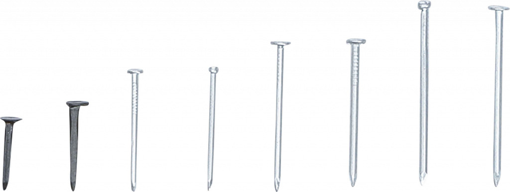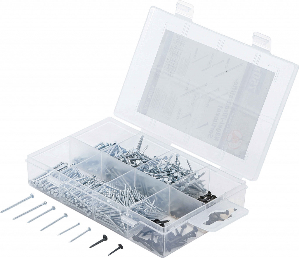 Komplet žebljev v škatli: 70 posebnih žebljev 11/14 mm, 340 standardnih žebljev 19/25/32 mm, 340 žičnih žebljev 19/25/32 mm.