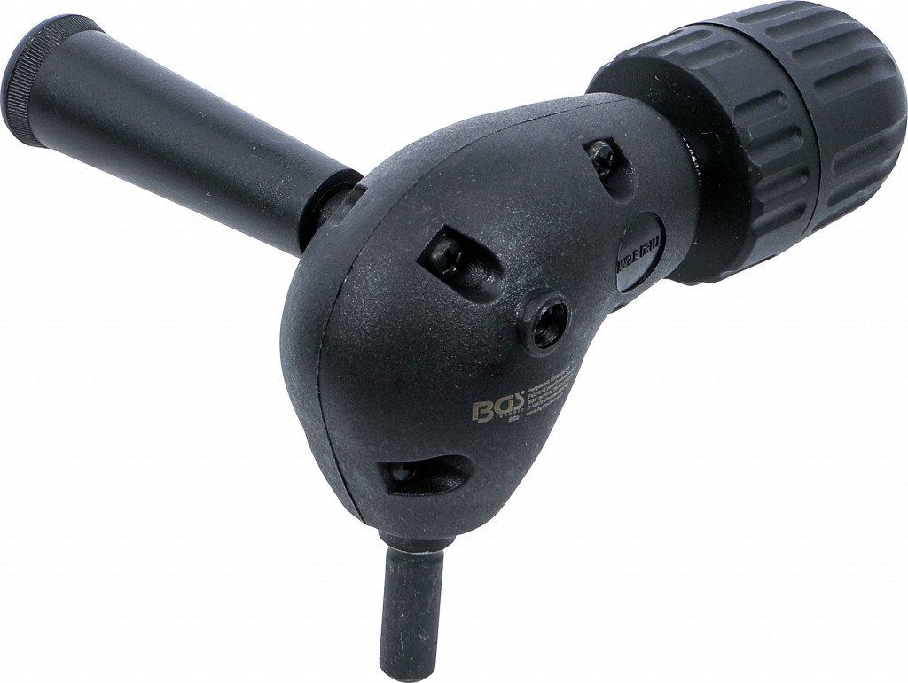 Kotna vrtalna glava za vijačenje in vrtanje na težko dostopnih mestih, ročaj se lahko pritrdi na obe strani, naprej/nazaj, primerna za svedre 0,8–10 mm, Ø pogonske gredi 9,5 mm, max. hitrost 500 obr/min, max. navor 30 Nm.