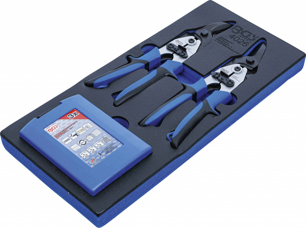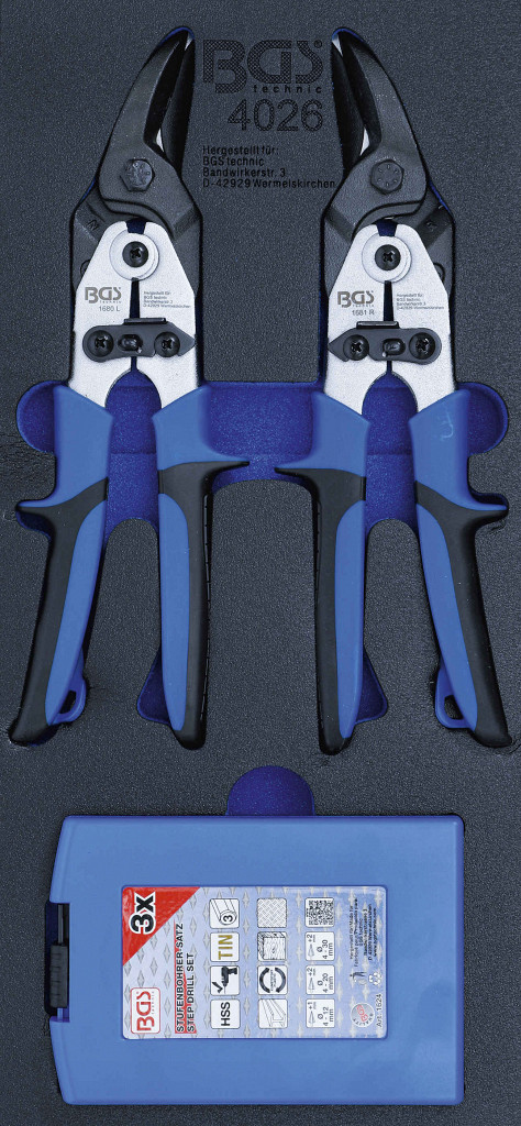 | Kovinske škarje in stopničasti sveder v peni 1/3 | z orodjem |