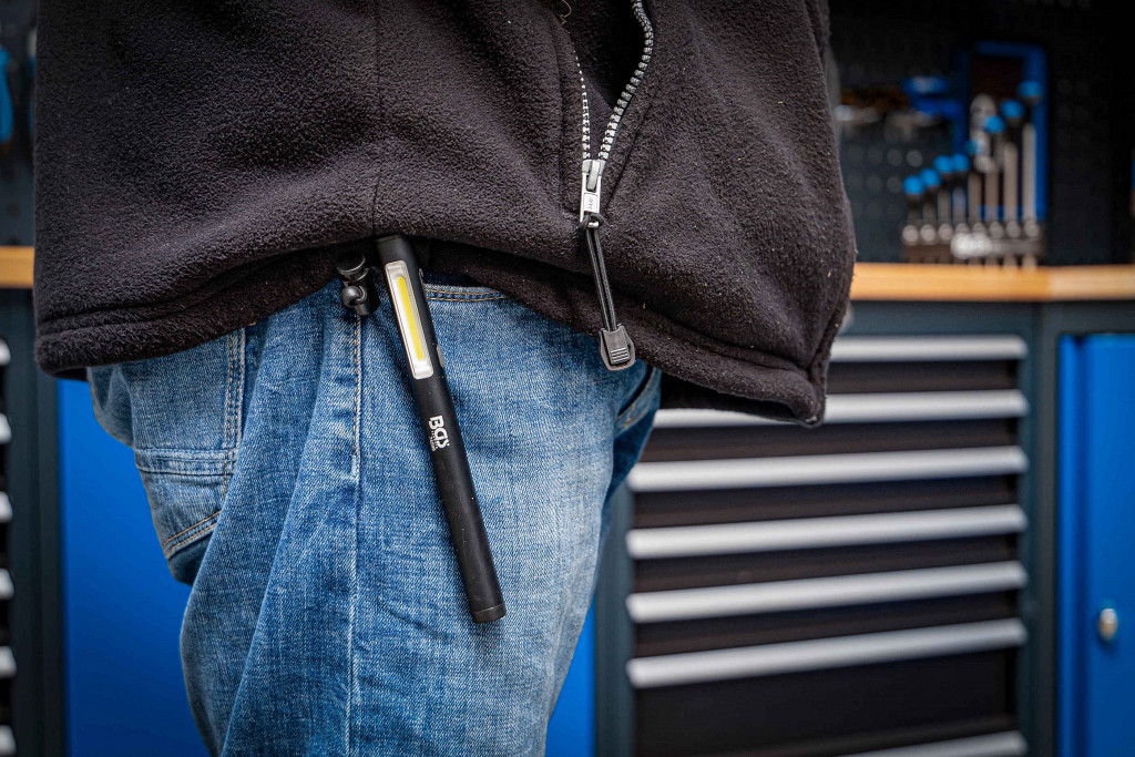 Za optimalno osvetlitev temnih delovnih površin v industriji, delavnicah, kampiranju ali domalahko se uporablja brez napajanjamajhen, kompakten in še posebej svetel z uporabo LED tehnologijeCOB LED glavni svetlobni vir na strani in zgornja osvetlitev LED z magnetno podlago in na hrbtni strani čas osvetlitve do 5 ur pritrdilna sponka za prsni žep ali pas s funkcijo vklopa / izklopavisoko robustno aluminijasto ohišje za visoko odpornost proti mehanskim udarcem enostavno upravljanje z eno roko večkratno upravljanje stikalo za vklop/izklop za zelo svetlo svetlobo z prikazom stanja baterije. glavni vir svetlobe: COB-LEDsvetlost (glavna luč): 100 lumnov (eko način)delovni čas (eko način)svetlost (eko način)svetlost (glavna luč): 300 lumnov (način napajanja)delovni čas (glavna luč): 2 h (način napajanja)zgornji vir svetlobe: SMD-LEDsvetlost (zgornja luč): 100 lumnovdelovni čas (zgornja luč): 2,5 h polnilna vtičnica: USB-C zahtevani polnilnik: 5 V 1 A USB A (ni vključeno v obseg dobave).obseg dobave: . 1 polnilni kabel LED Penlight1