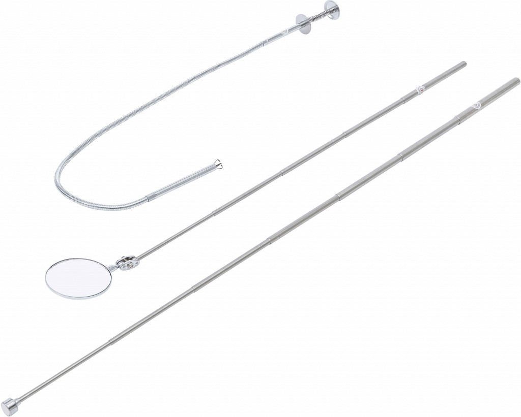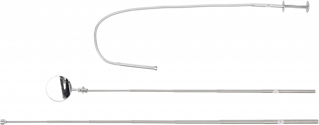 Fleksibilno prijemalo dolžine 610 mm za matice, vijake in dele do Ø 35 mm, teleskopsko magnetno prijemalo 128–635 mm z močnim neodimskim magnetom Ø 9 mm, teleskopsko ogledalo 200–542 mm z Ø 60 mm.