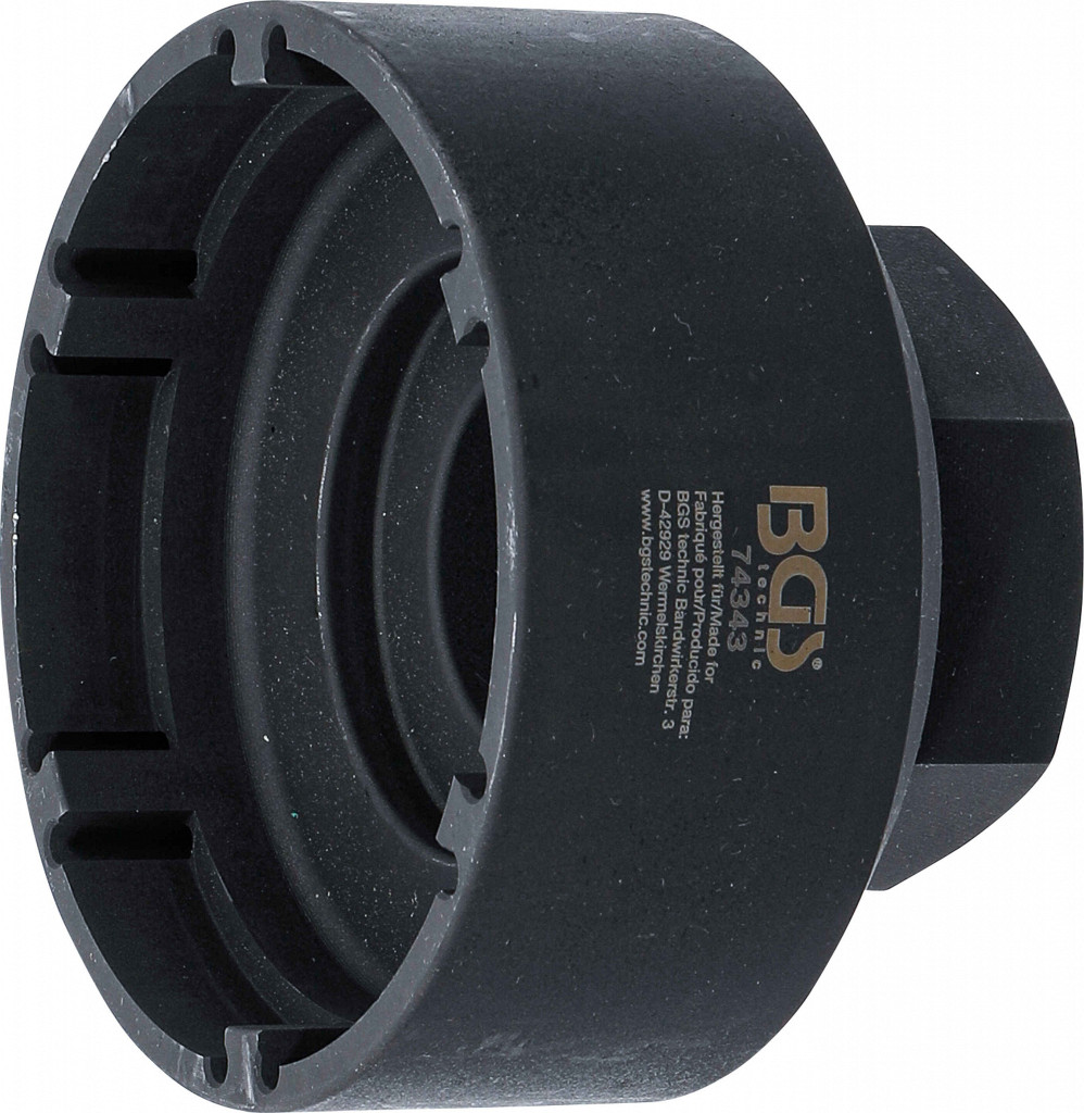 Za sprednjo os MAN V9-82L-01 (kolutna zavora + ABS)zasnovan za visoke zategovalne in popuščalne navore s 6 zobmi za utorne matice.. Velikost ključa: notranja 101 mm / zunanja 110 mm