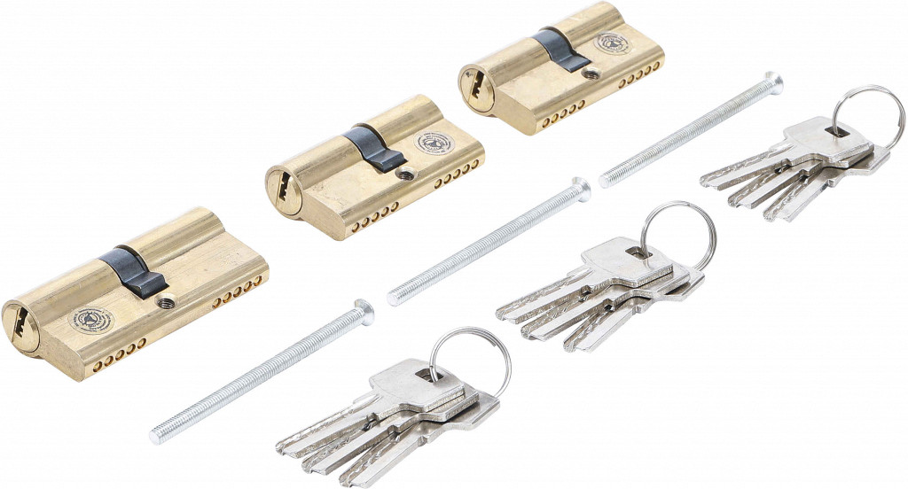 Komplet cilindrov "mali sistem glavnega ključa", robustna izvedba, vsebuje 2 cilindra 60 mm, 1 cilindri 70 mm, 9 ključev z istočasnim odpiranjem in 3 vijake.