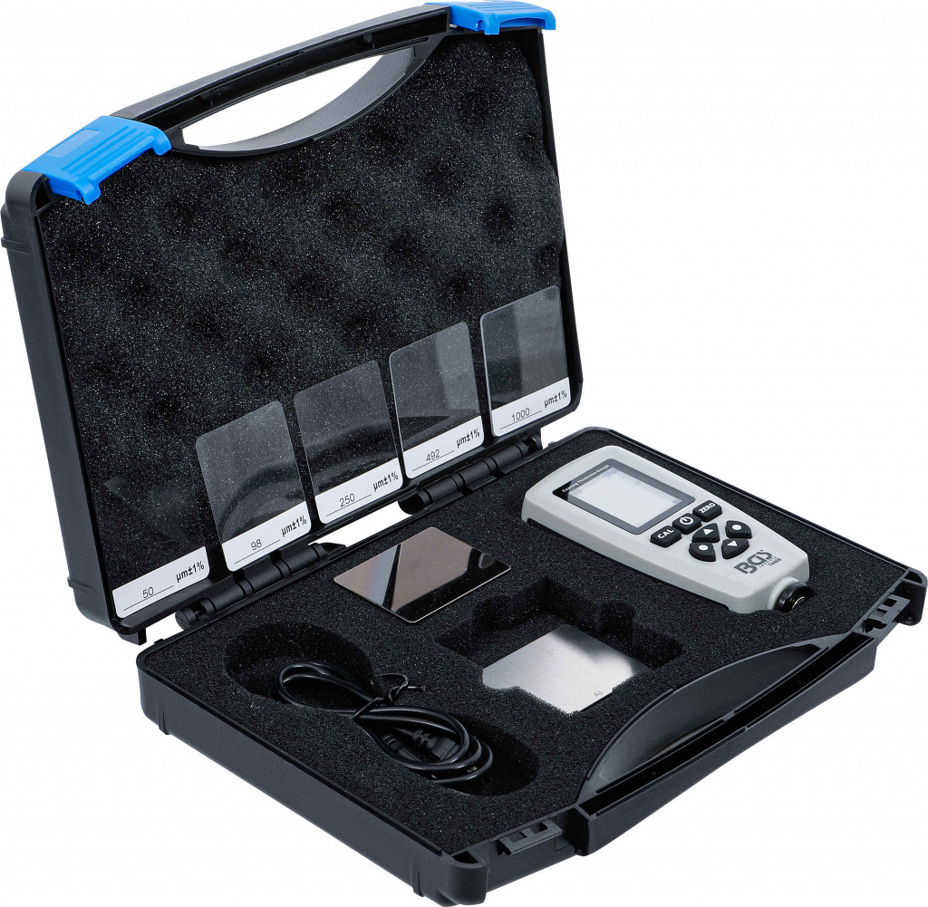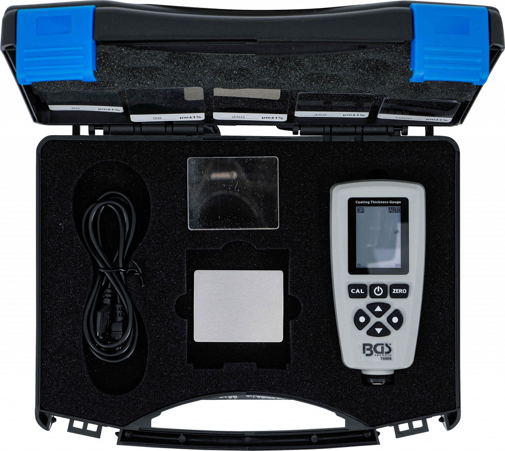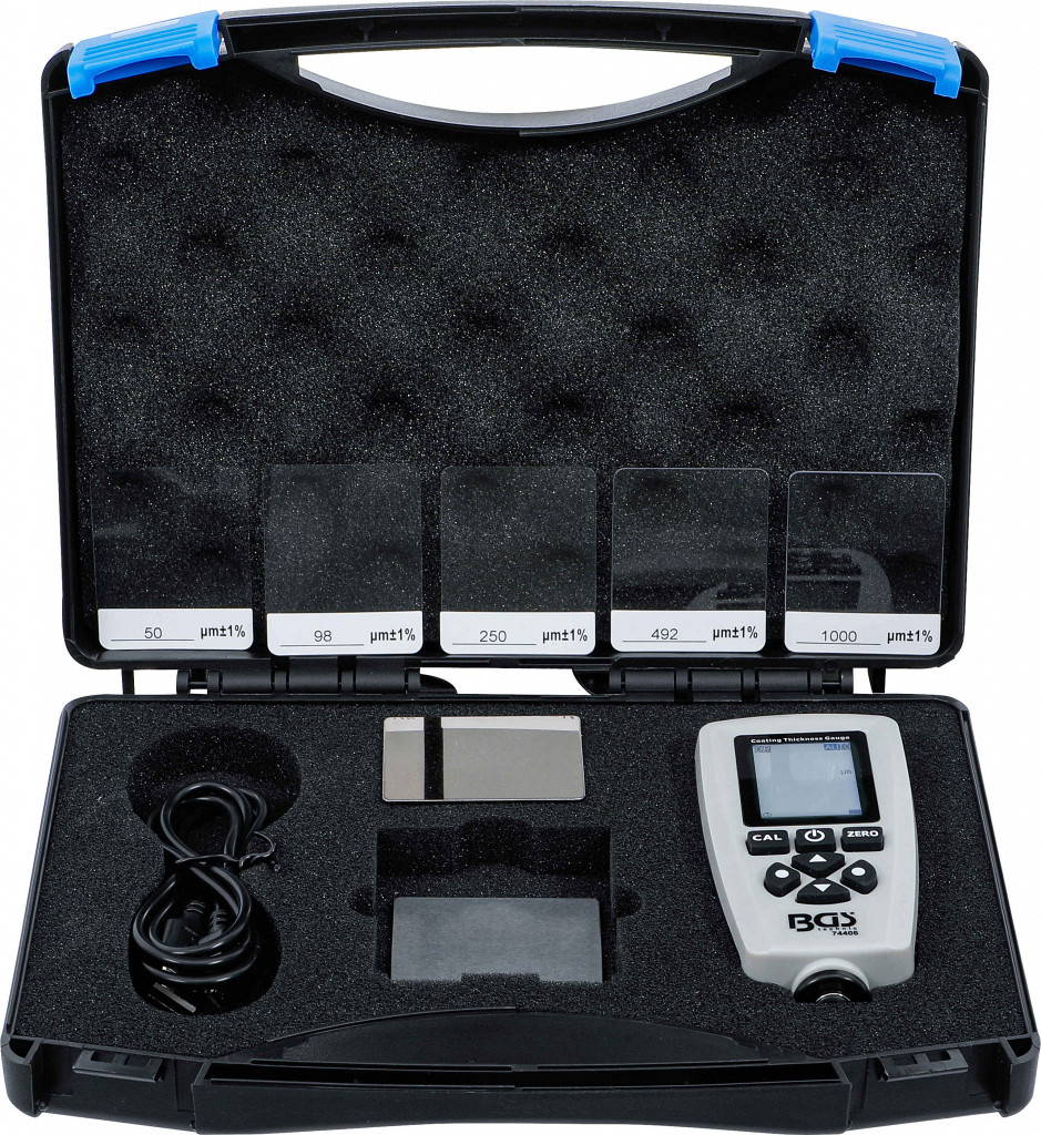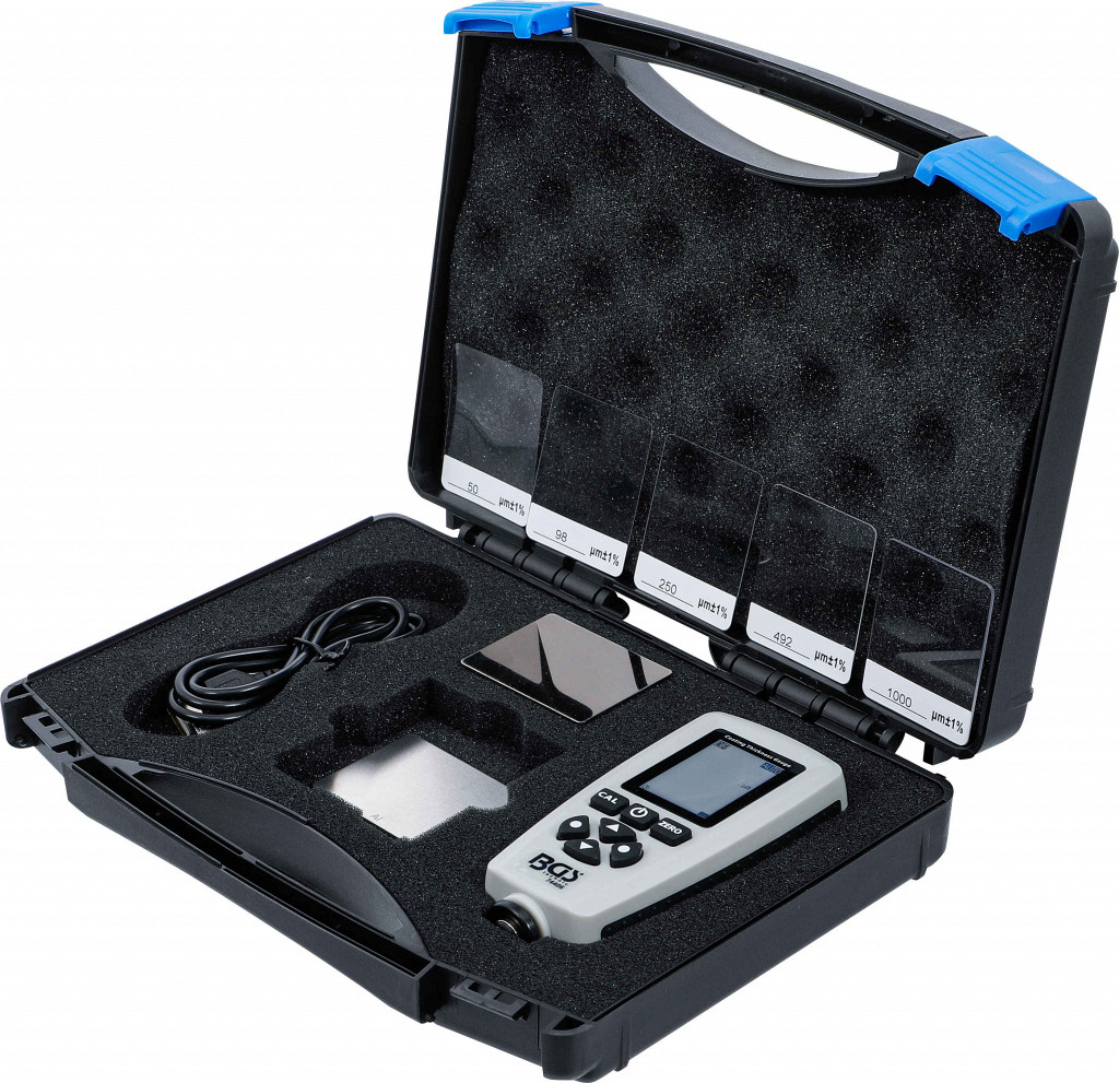 Za nedestruktivne meritve debeline premazaprimerno za nemagnetne premaze, kot so barve, emajl, krom na železnih kovinah in izolacijske premaze, kot so barve, eloksirane na barvnih kovinahLCD zaslon z matriko 128 x 128 pik lahko razumljiva navigacija po menijurazlični načini merjenja, kot so enojne in neprekinjene meritvenačini sond, kot so indukcija in vrtinčni tokoviskupinski načini, kot so direktni (DIR), odčitki se izgubijo ob izklopu in splošno (GEN), odčitki so shranjeni na izklopu80 bralni pomnilnik za vsako skupino zero in večtočkovno kalibracijo (do 4 točke) za vsako skupinopriklic ali brisanje posameznih shranjenih odčitkov in brisanje skupinskih odčitkovprikaz statistike za srednje, najmanjše, največje in odstopanjedoločljiv alarm zgornje ali spodnje mejefunkcija samodejnega izklopaUSB vmesnik za prenos podatkovizpolnjevrednost baterije in indikator napake.. natančnost (indukcija): +/- (2,5 % + 1 μm)natančnost (vrtinčni tokovi): +/- (2 % + 0,039 mils)ločljivost: 0 μm - 99,9 μm (0,1 μm) / 100 μm - 999 μm (1 μm) / >. 1000 μm (0,01 mm)najmanjša debelina podlage (indukcija): 0,2 mmminimalna debelina podlage (vrtinčni tokovi): 0,05 mmminimalna merilna površina: Ø 20 mmmaksimalna hitrost merjenja: 2 odčitka na sekundonapajanje: 2x 1,5 V baterija AAAvlažnost delovanja: 20 - 90%Merske enote: μm, mm, milsDimenzije: 110 x 53 x 24 mm