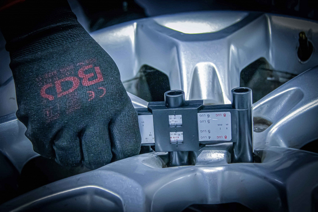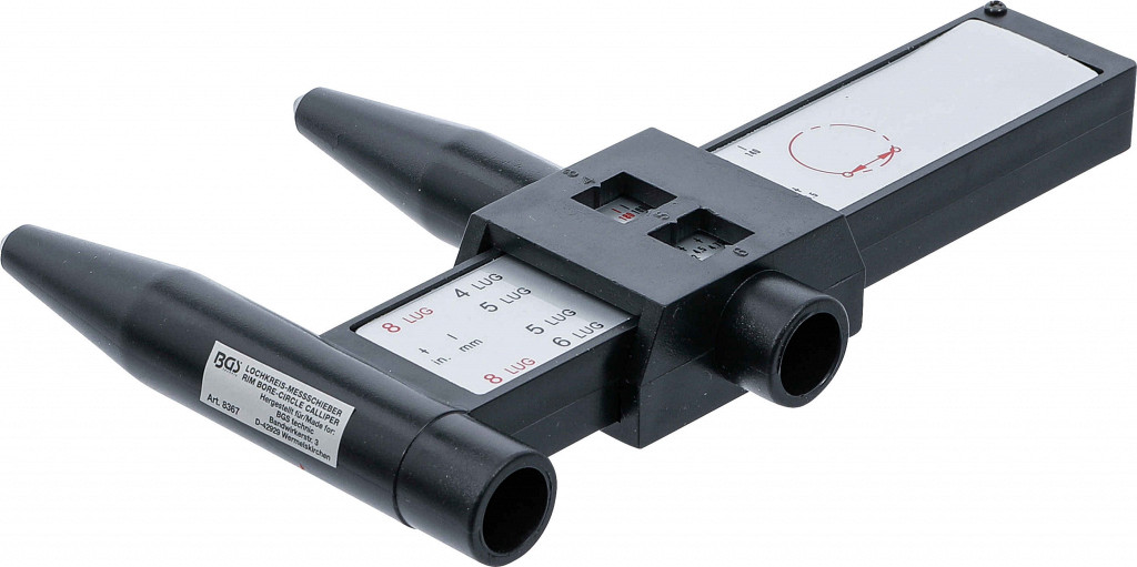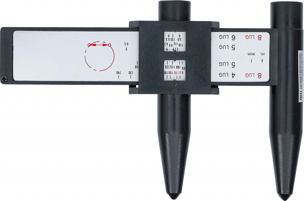 Merilnik razdelilnega kroga na jeklenih in aluminijastih platiščih. Močno olajša določanje kroga vijakov. Primeren za 4-, 5-, 6- in 8-luknjasta platišča.