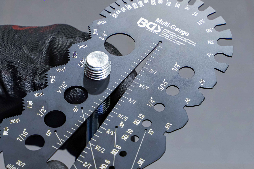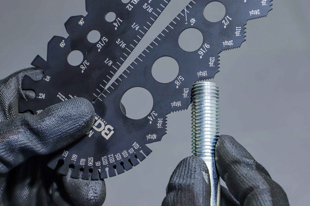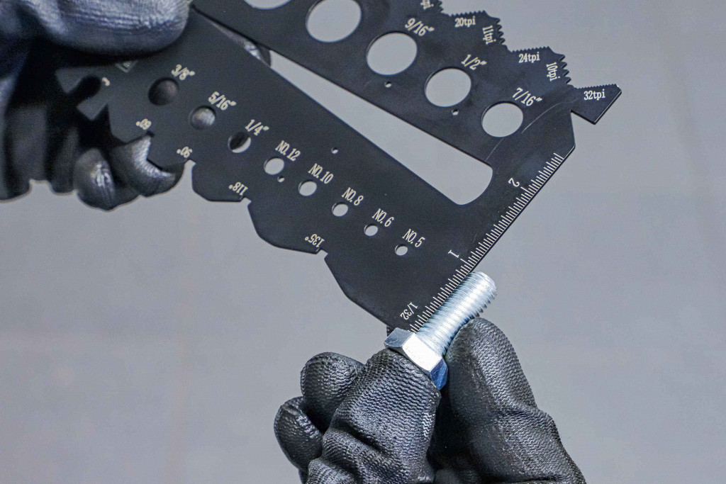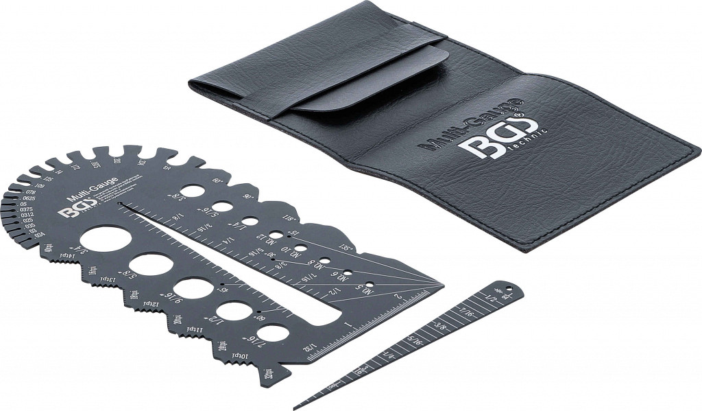 Uporaben pomočnik, ki ne sme manjkati v nobeni orodni škatli za hitro in natančno določanje dimenzij vijakov, vijakov, svedrov, podložk in drugih okroglih materialovvečnamensko orodje v obvladljivi velikosti in obliki ploščatega kartona za uporabo v delavnici za popravila vozil, kjer je treba natančno določiti ustrezne velikosti. Velikost navoja na vijakih in vijakih: št. 5 - 6 - 8 - 10 - 12 in 1/4 - 5/16 - 3/8 - 7/16 - 1/2 - 9/16 - 5/8 - 3/4 "Nagibi navojev na vijakih in vijakih: 10 - 11 - 12 - 13 - 14 - 16 - 18 - 20 - 24 - 32 - 40Premer vrtalnikov: 0.024 - 0,03 - 0,035 - 0,025 - 0,0312 - 0,0375 - 0,05 - 0,0625 - 0,078 - 0,109 - 0,125 - 0,14 - 0,172 - 0,1875 - 0,203 - 0,234 - 0,25" notranji premer lukenj in zunanji premer okroglih materialov: 1/64 - 1/8-3/16 - 1/4 - 5/16 - 3/8 - 7/16 - 1/2" (1/64" podrazdelitev)Merjenje dolžin: 1/32" - 2" merjenje kota: 60 - 90 - 118 - 135°