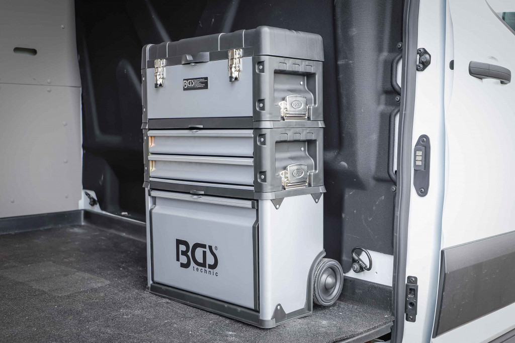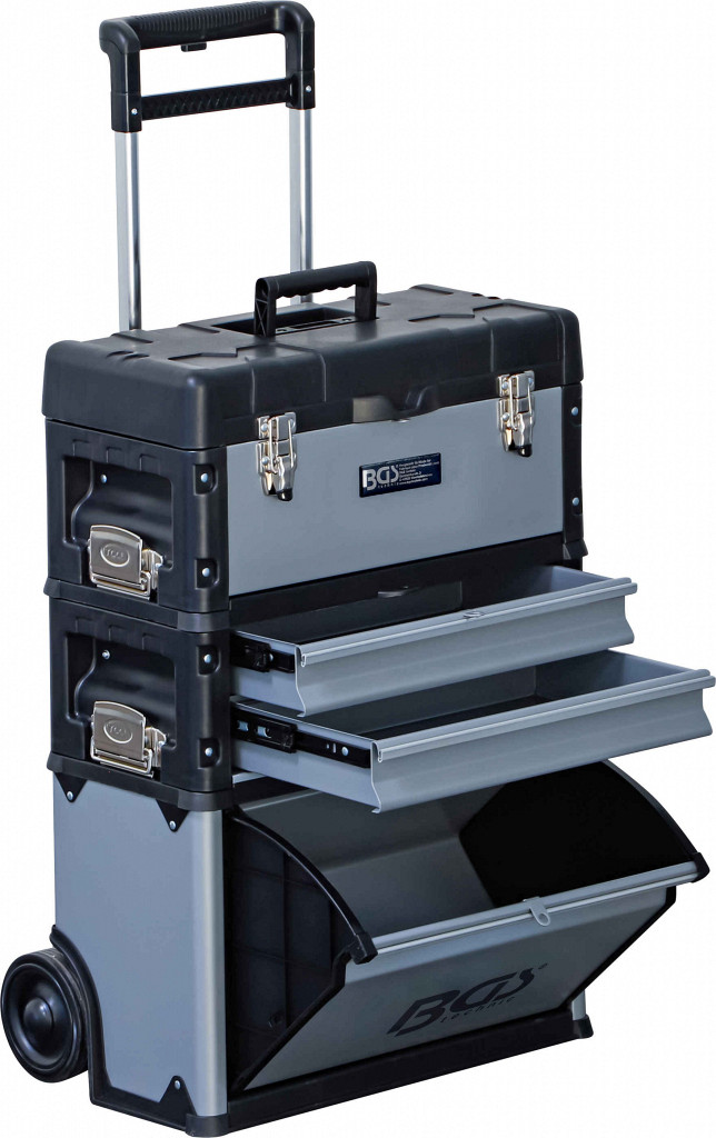 Sestavljen iz treh odstranljivih delov: 1 škatla z loputastim pokrovom in ročajem, 2 predala, 1 velika škatla s sprednjim pokrovom. Idealno za monterje, mehanike, električarje ipd. Zgornja in srednja škatla se zakleneta skupaj z osnovno.