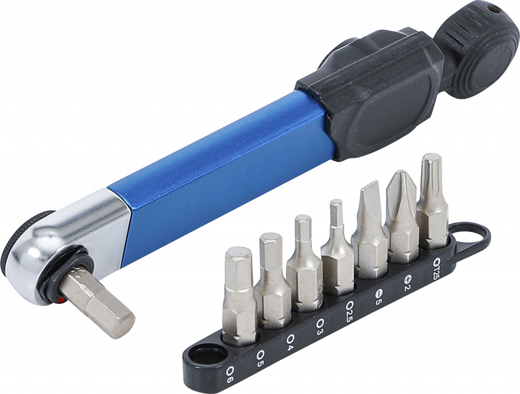 Inovativno in ultra kompaktno orodje omogoča enostavno in natančno montažo in demontažozdružuje natančen momentni ključ in 2-smerno zaskočnico v enem orodjuza izbiro določenega navora, preprosto pritisnite gumb za nastavitev na koncu ključa in izberite navorenostaven za branje lestvicenastavljiv od 2 do 10 Nm v korakih po 0,5 Nm v smeri urinega kazalcabit nastavljen v držalo, pogon 6,3 mm (1/4"), dolžina 25 mm. 5 šesterokotnih bitov, 2,5 - 3 - 4 - 5 - 6 mm1 z režami, SL51 s križno režo, PH21 s T-zvezdico, T25
