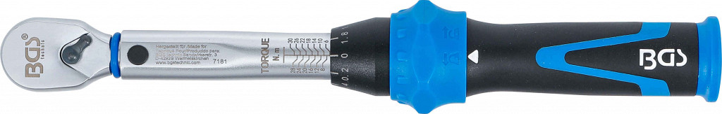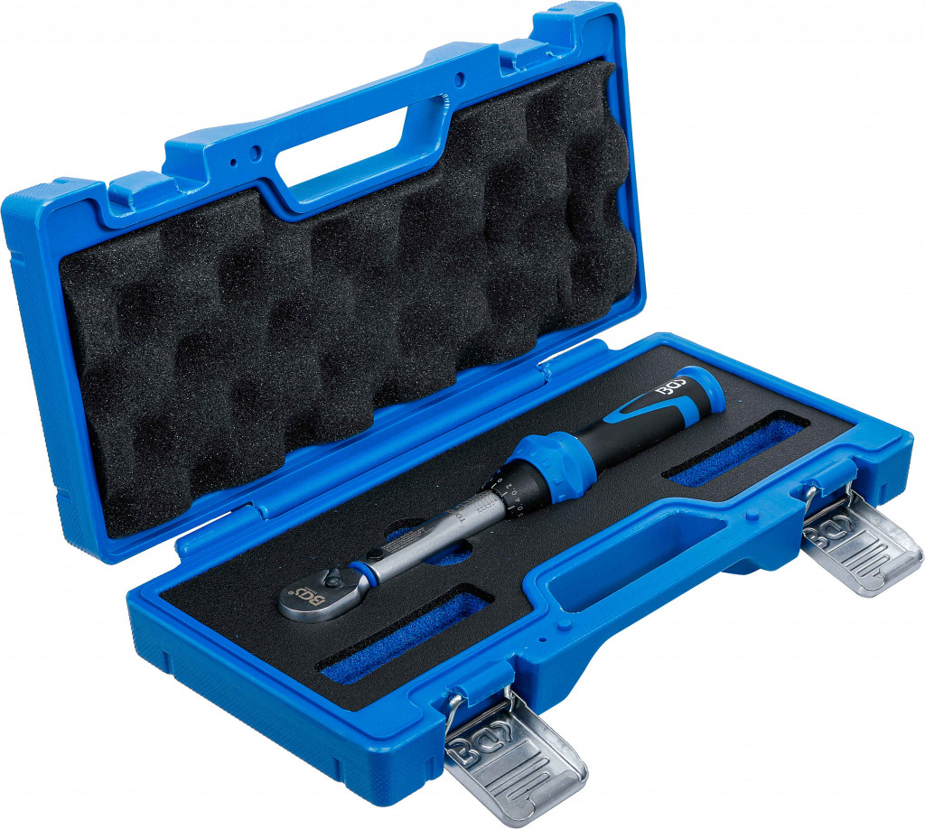 Navorni ključ z obratno ragljo in 72 zobmi, z ozko glavo, lasersko gravirana skala z nastavitvijo po 0.2 Nm, plastični ročaj za varno nastavitev, slišno sproščanje, shranjeno v penastem vložku in kovčku, priložen certifikat o kalibraciji, smer zategovanja v desno.