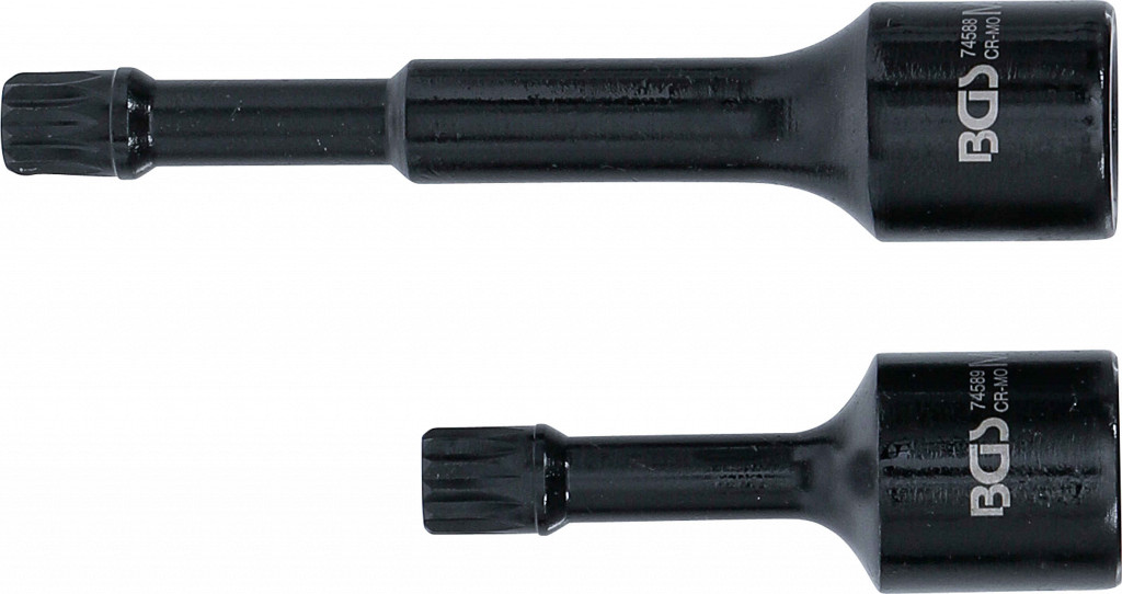 Za sprostitev vijačnega priključka kolesnega ležaja v aluminijastem ohišju z vgrajeno pogonsko gredjo ekstra tanka koničasta gred za zaprte prostore za vgradnjoprimerna za 4-členno os (72 mm) in vzmetne opornike McPherson (115 mm) za ročno upravljanje. 1 posebna vtičnica za udarne bite | dolžina 115 mm | 12,5-milimetrski (1/2-palčni pogon) | Žleb (za XZN) M12 | za VAG (BGS 74588)1 posebna vtičnica za udarne bitove | dolžina 72 mm | 12,5-milimetrski (1/2-palčni pogon) | Žleb (za XZN) M12 | za VAG (BGS 74589)
