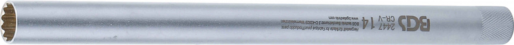 Izhodni profil: 12-točkovni; Profil pogona: notranji kvadrat; Velikost profila pogona, palec: 3/8 "; Velikost profila pogona, metrična: 10 mm; Zunanji premer: 18,5 mm; Bruto teža: 358 g; Dolžina: 250 mm; Material: krom-vanadijevo jeklo; Površinska obdelava: Satensko kromirano; Velikost ključa: 14 mm; Embalaža primerna za stensko obešanje: Da