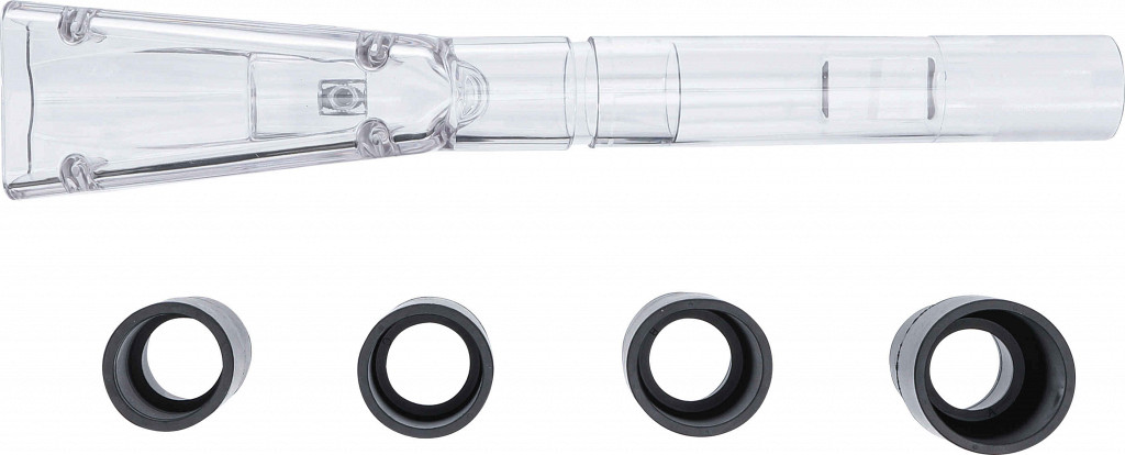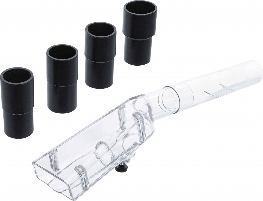 Sesalni nastavek za uporabo s pištolo za čiščenje s twister vrtinčenjem, pritrjen z navojnim vijakom, za hkratno sesanje tekočin in umazanije, preprečuje vdor tekočine v globino in čisti osnovno napravo, vključen 4-delni adapter za različne mokre sesalnike, komplet vsebuje majhen sesalni nastavek in adapterje Ø 33–35, 38–40, 40–42, 45–47 mm.