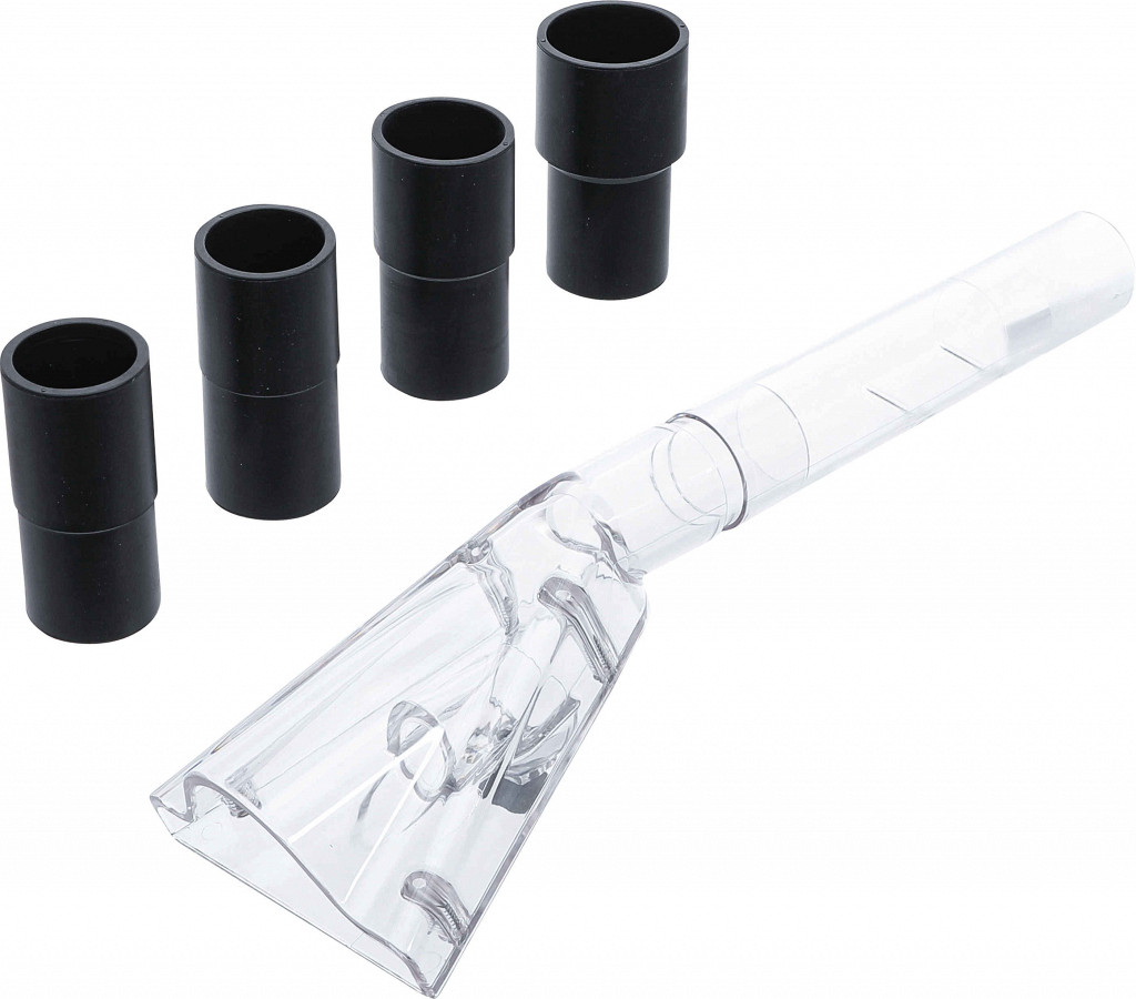 Sesalni nastavek za uporabo s pištolo za čiščenje s twister vrtinčenjem, pritrjen z navojnim vijakom, za hkratno sesanje tekočin in umazanije, preprečuje vdor tekočine v globino in čisti osnovno napravo, vključen 4-delni adapter za različne mokre sesalnike, komplet vsebuje velik sesalni nastavek in adapterje Ø 33–35, 38–40, 40–42, 45–47 mm.