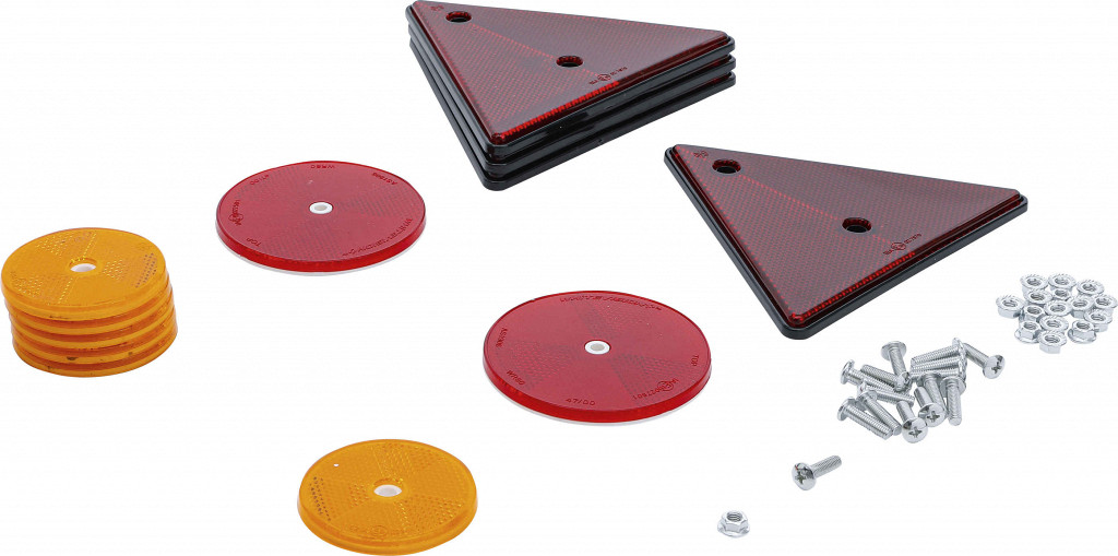 Set odsevnikov z E9 in E11 certifikatom. Vsebina: 4 trikotni rdeči (150 mm), 2 okrogla rdeča Ø 80 mm, 6 okroglih rumenih Ø 60 mm.