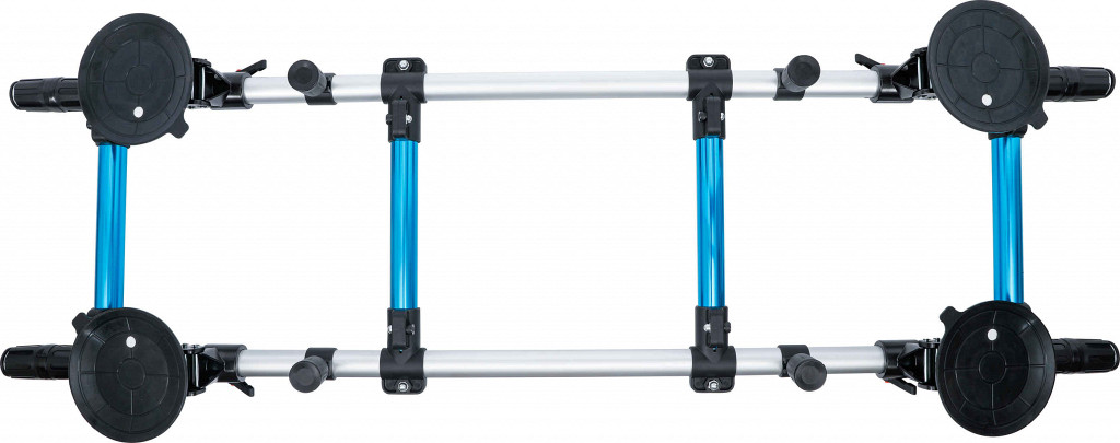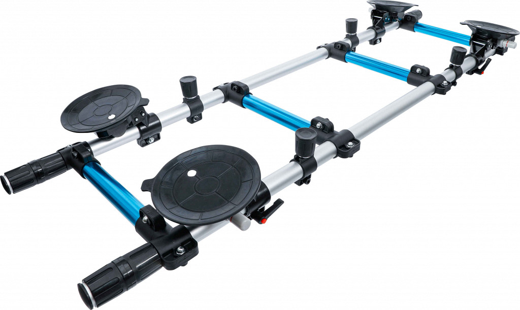 Nosilec s 4 priseski s podprto vakuumsko črpalko za montažo in demontažo večjih vetrobranskih stekel. Priseski so gibljivi za prilagoditev ukrivljenosti stekla. Dimenzije okvirja: 1310 × 280 mm, Ø priseskov 150 mm, nosilnost do 80 kg, aluminijasta konstrukcija.