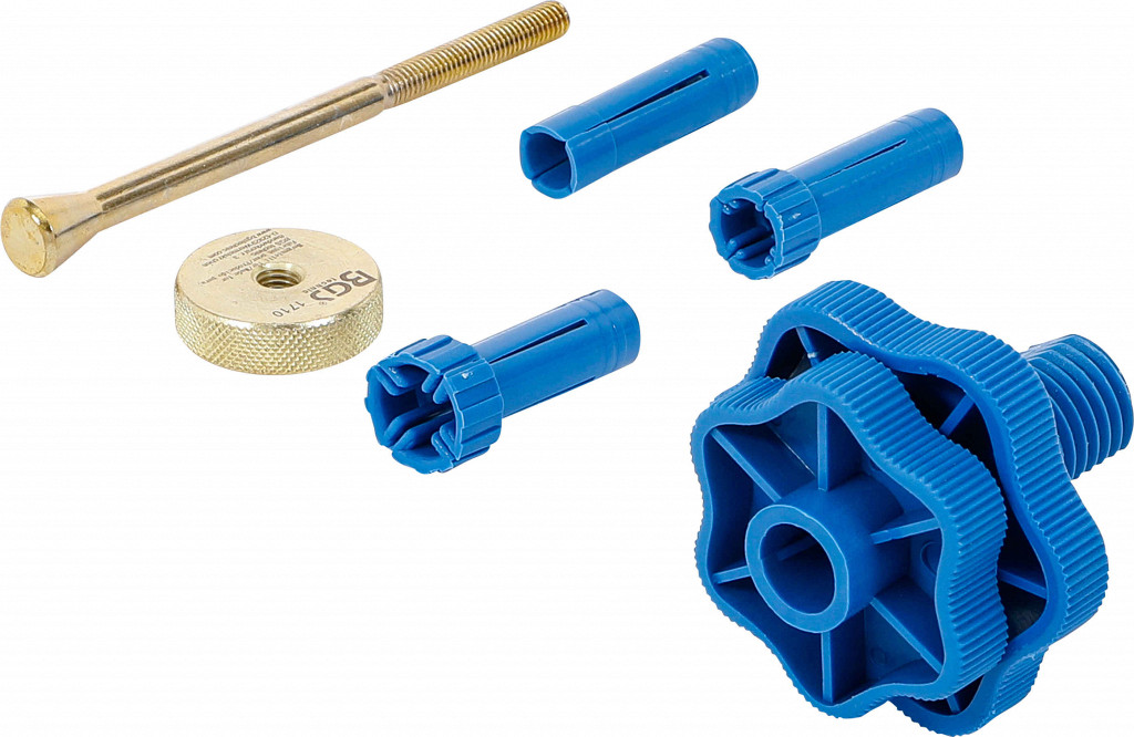 za centriranje sklopke v vozilih brez vodilnega ležaja; univerzalna uporaba s premerom pesta 15.0–28.0 mm; neprekinljivo nastavljiv premer 15.0–21.0 / 17.0–25.0 / 22.0–28.0 mm; vsebuje: 1 centrirno orodje s stožčastim vpenjalom; 2 stožčasta vpenjala 15.0–21.0 / 17.0–25.0 mm