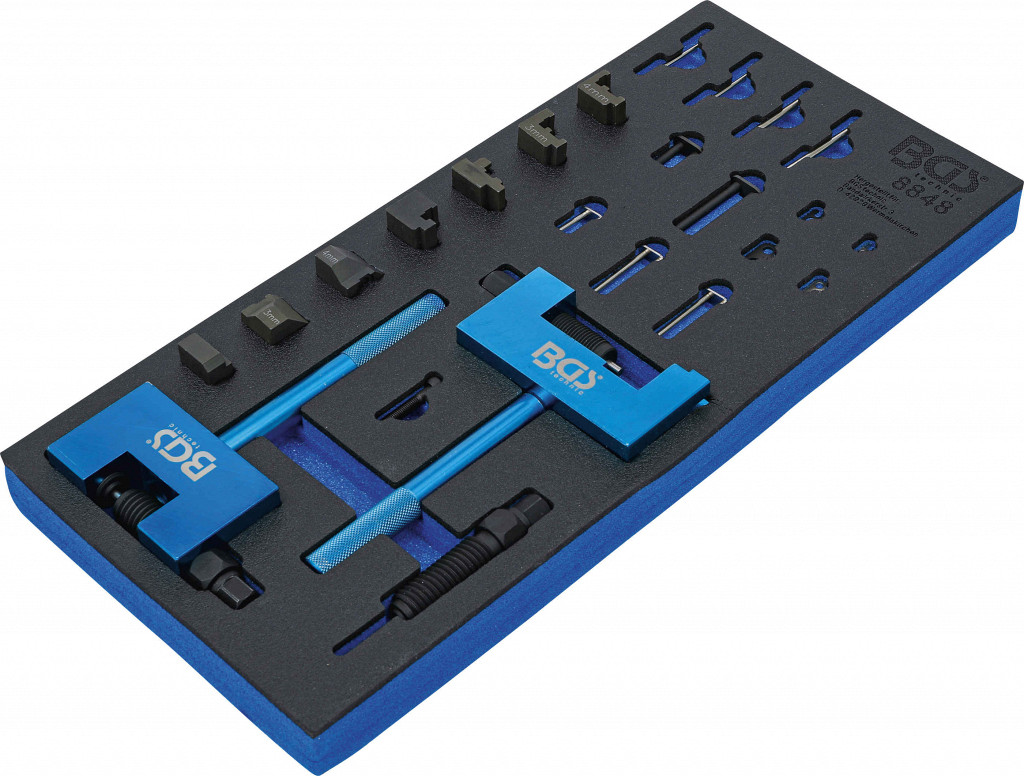 Orodje za menjavo in kovičenje enorednih in dvorednih verig. Primerno za novejše in starejše Mercedes-Benz motorje z verižnimi zatiči 3 ali 4 mm. Nova veriga se lahko potegne z uporabo stare, brez razstavljanja ohišja. Vsebina: izvlekači, spojni členi za enoredne in dvoredne verige 3 mm in 4 mm, zapiralne sponke in ploščice, tlačni nastavki, orodje za kovičenje verige, vijaki, orodje za rezanje verige, vretena za ločevanje.