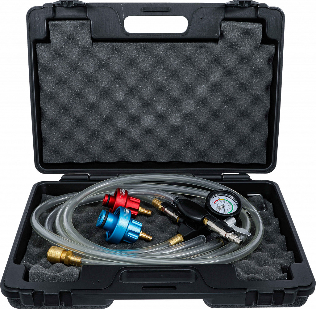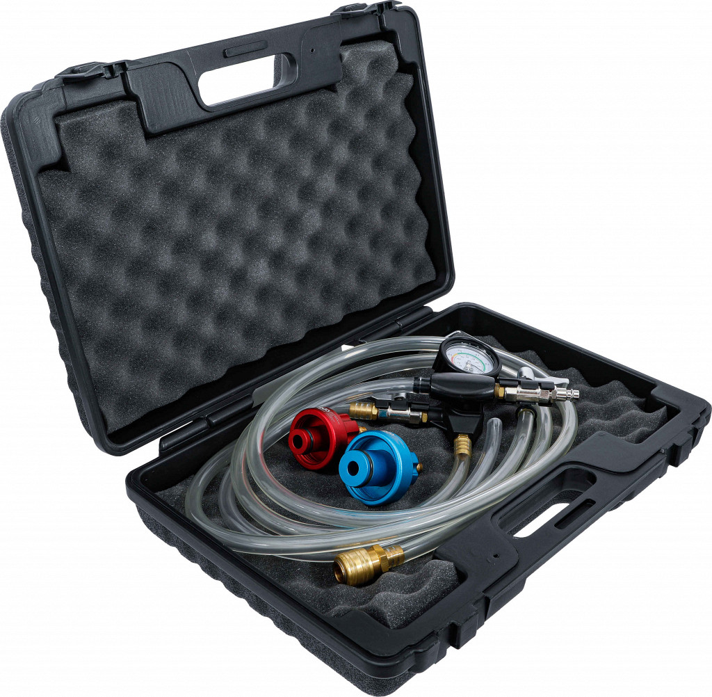 Naprava za hitro vakuumsko polnjenje hladilnih sistemov s stisnjenim zrakom. Posebej primerna za vozila Tesla (Model S, X, 3, Y). Vključuje merilnik tlaka, cevi in adapterje.