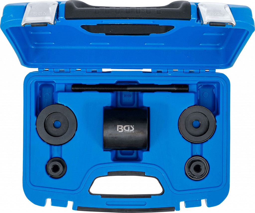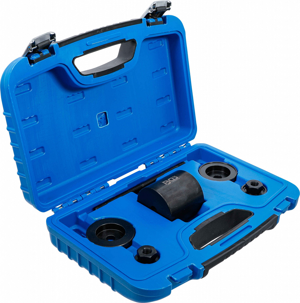 Orodje za demontažo in montažo zadnje puše nihajne roke. Primerno za Ford Fiesta/Ka od 1996 dalje. Uporaba neposredno na vozilu. Vsebina: vreteno, matica, potisna čaša, sprejemna čaša, vstavljalna čaša, matica z ležajem.
