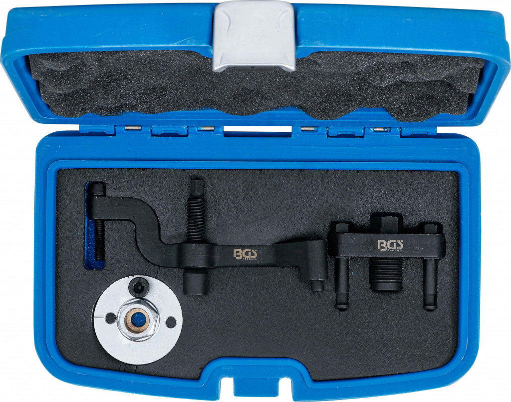 Set za motorje VW T5 in Touareg 2.5D (AXD, AXE, BAC, BLJ, BLK, BNZ, BPD, BPC, BPE), vsebuje snemalce zobnikov vodne črpalke, ključ za proti-vrtenje ročične gredi.