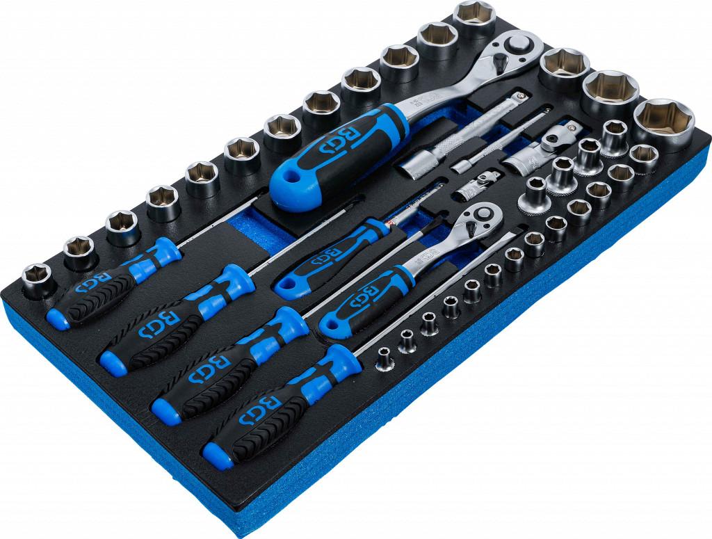 Pladenj za orodje iz visoko odporne pene. Primeren za zgornje predale vozička BGS 2002 in zgornjega kovčka BGS 2002-2. Vsebina: povratne raglje, nasadni ključi, podaljški in kardanski zglobi iz krom-vanadijevega jekla, izvijači iz visokokakovostnega krom-vanadijevega jekla (S2). Obseg dobave: 2 raglji (1/2" in 1/4"), 2 kardanska zgloba, 2 nihajna podaljška, držalo za nastavke, 32 nasadnih ključev 4–32 mm, 4 izvijači SL in PH/PZ, prazen penasti vložek BGS 2002-4.
