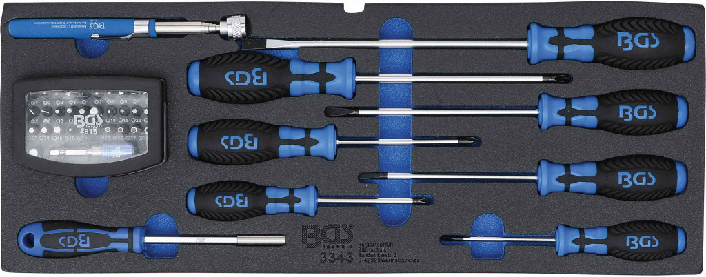 Primerno za kovčke za orodja št. 3312 & 3318, izvijač režni: 4 x 80 mm - 5,5 x 125 mm - 6,5 x 150 mm - 8,0 x 200 mm, izvijač križni PH: PH1 x 80 mm - PH2 x 100 mm - PH3 x 150 mm, vrtljivi ročaj za bite z magnetom, profil: notranji šestkotnik, profilna velikost, metrična: 6,3 mm, profilna velikost, palčni: 1/4", dolžina: 200 mm, set barvnih bitov, inteligentni barvni vodnik, vsak profil je dodeljen barvi, 30 bitov, dolžina 25 mm: režni sl 3-4-5-6 mm, križni PH1 - PH2 - PH2 - PH3, križni PZ1 - PZ2 - PZ2 - PZ3, notranji šestkotnik 3 - 4 - 5 - 6 mm, T-Star (za Torx) T10 - T15 - T20 - T25 - T27 - T30 - T40, T-Star tamperproof (za Torx): T10 - T15 - T20 - T25 - T27 - T30 - T40, 1 bit adapter, 1 bit držalo s hitrim sprostilnim mehanizmom, magnetni dvigalo, premer glave/magneta 15 mm, odstranljiva zaščitna prevleka preprečuje bočni magnetni učinek, tako da se privlačijo le želeni deli, gumijast ročaj z nosilcem sponke, maks. dolžina: 650 mm