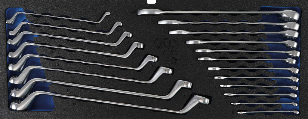 Hladno kovačeno, utrjeno, profil obročaste strani: 12-točkovni, glava obroča 15° nagibna, primerno za kovčke za orodja št. 3312 & 3318, 12 kombiniranih ključev 6 - 7 - 8 - 9 - 10 - 11 - 12 - 13 - 14 - 17 - 19 - 22 mm, 8 dvojnih obročnih ključev, globoko pomaknjenih, 6x7 - 8x9 - 10x11 - 12x13 - 14x15 - 16x17 - 18x19 - 20x22 mm