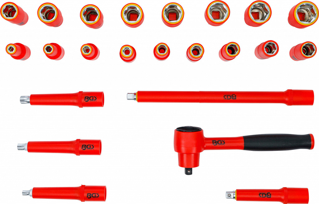 Popolna kombinacija orodij za uporabo v vrsti električnih inštalacij ali za popravila in vzdrževalna dela na hibridnih in električnih vozilihopremljena z izoliranimi orodji in preizkušena v skladu z DIN EN/IEC 60900VDE izolirana do 1000 V pladenj za orodje iz visoko odporne peneorodja so zaščitena v pladnju iz trde pene in so shranjena v vdolbinah na nedrseč načinvsak posamezen orodje ima svoje ustrezno mestoprimerno za sistemsko ohišje BGS BOXSYS1 in BOXSYS2tudi primerno za sistemske ohišja blagovnih znamk Makita, Festool in Stier. Obseg dobave: 1 VDE reverzibilna zaskočnica | fini zob | 10 mm (3/8") | 1000 V, s hitrim sprostitvijo, št. število zob v glavi zaskočke: 72, dolžina: 200 mm (BGS 701)1 vdno vtičnico, šesterokotnik 6 mm, dolžina: 72 mm1 VDE vtičnica, šesterokotnik 7 mm, dolžina: 72 mm1 VDE vtičnica, šesterokotnik 8 mm, dolžina: 72 mm1 VDE vtičnica, šesterokotnik 9 mm, dolžina: 72 mm1 VDE vtičnica, šesterokotnik 10 mm, dolžina: 72 mm1 VDE vtičnica, šesterokotnik 11 mm, dolžina: 72 mm1 VDE vtičnica, šesterokotnik 12 mm, dolžina: 72 mm1 VDE vtičnica, šesterokotnik 13 mm, dolžina: 72 mm1 VDE vtičnica, šesterokotnik 14 mm, dolžina: 72 mm1 VDE vtičnica, šesterokotnik 15 mm, dolžina: 72 mm1 VDE vtičnica, šesterokotnik 16 mm, dolžina: 72 mm1 VDE vtičnica, šesterokotnik 17 mm, dolžina: 72 mm1 VDE vtičnica, šesterokotnik 18 mm, dolžina: 72 mm1 VDE vtičnica, šesterokotnik 19 mm, dolžina: 72 mm1 VDE vtičnica, šesterokotnik 20 mm, dolžina: 72 mm1 VDE vtičnica, šesterokotnik 21 mm, dolžina: 72 mm1 VDE vtičnica, šesterokotnik 22 mm, dolžina: 72 mm1 VDE podaljšek, dolžina: 100 mm1 VDE podaljšek, dolžina: 250 mm1 VDE vtičnica, 10 mm (3/8") pogon | žleb (za XZN) M8, dolžina: 67 mm1 VDE vtičnica, 10 mm (3/8") pogon | žleb (za XZN) M10, dolžina: 67 mm1 VDE vtičnica, 10 mm (3/8") pogon | žleb (za XZN) M12, dolžina: 67 mm