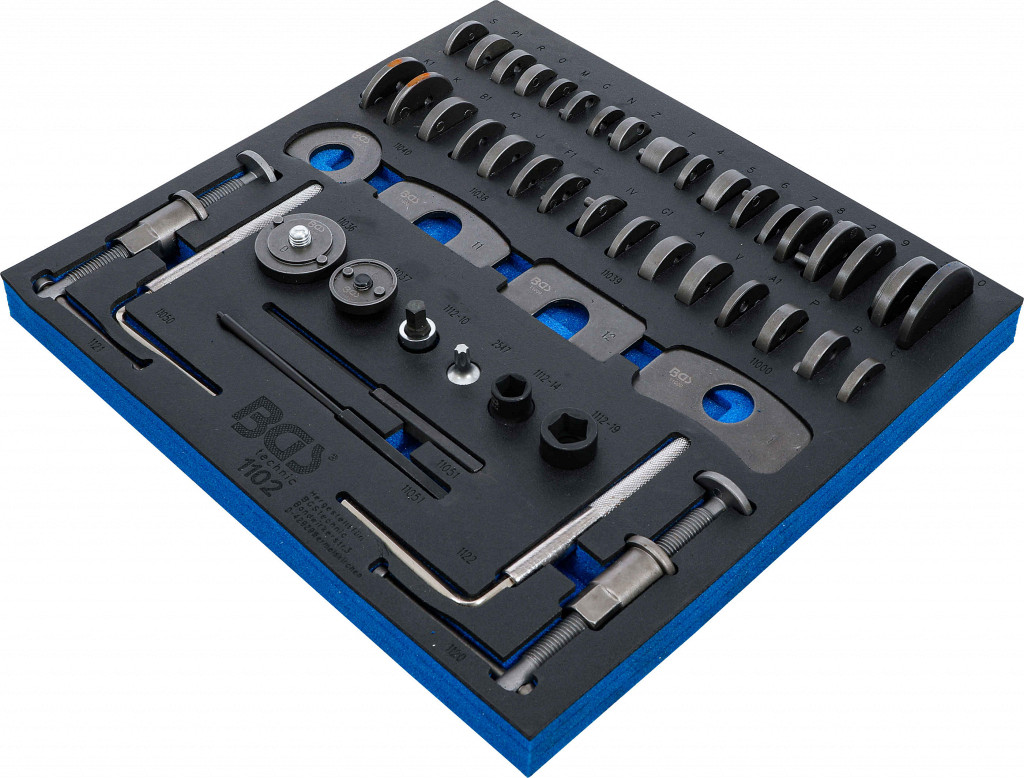 Komplet za vračanje zavornega bata, npr. pri menjavi zavornih ploščic. Vsebuje navijalno vreteno (v smeri urinega kazalca), navijalno vreteno (v nasprotni smeri urinega kazalca), izbijala s premerom 5,4 mm, izbijala s premerom 6 mm in 3 mm zatičem, šestrobna ključa L 6 mm in 8 mm, udarna nasadna ključa 6-robna 12,5 mm (1/2") v velikostih 19 mm in 14 mm, nasadni ključ 12,5 mm (1/2") 10 mm, T-Star nasadni ključ (Torx) 10 mm (3/8") T45, 4 pritrdilne plošče ter 35 navijalnih adapterjev, primernih za večino modelov (BMW, VW, Škoda, Seat, Ford, Honda, Alfa Romeo, Suzuki, Nissan, Toyota itd.).