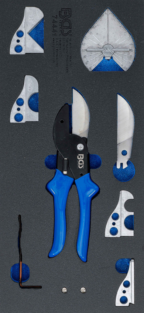 Za rezanje plastičnih vodovodnih cevi, plastičnih povezovalnih cevi, plastičnih trakov, vej, kablov itd.integrirani kotomer omogoča hitro in enostavno rezanje do popolne mitraprimerno za cevi s premerom 16 - 19 - 25 mmnastavljiv kot rezanja 45 - 60 - 75 - 90 - 105 - 120 - 135 stopinjstabilni jekleni okvir iz jekla SK5ergonomski, nedrseči plastični ročaji za udobno deloposebej primerni za vodovodarje, električarje in mizarje.. Material rezila: nerjaveče jekloMaterial zadrževalnih oblik: aluminij. Obseg dobave: 1 rezalne klešče1 rezilo1 držalna oblika, črka V 90 stopinj1 držalna oblika, črka U 16 mm1 držalna oblika, črka U 19 mm1 držalna oblika, črka U 25 mm1 držalna oblika, nastavljiva kot1 držalna oblika, ploska2 rezervna vijaka1 ključ tipa L