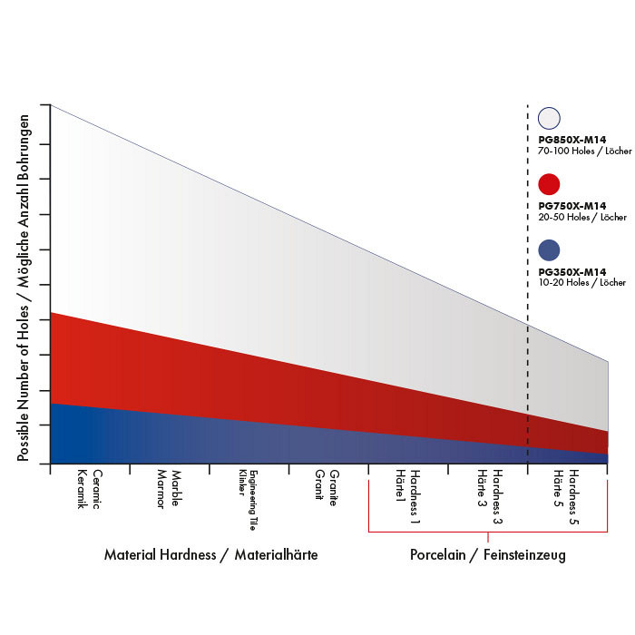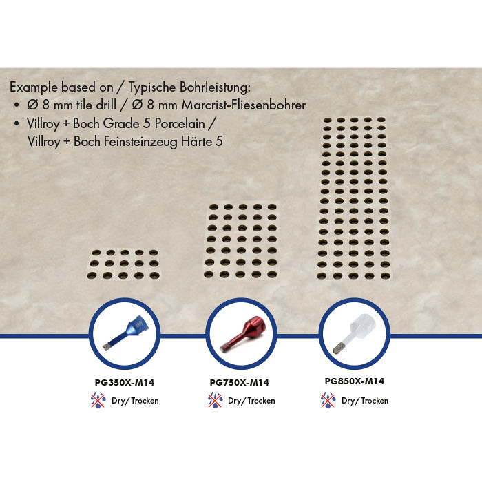 Opis Na voljo so 3 različni kompleti s svedri od Ø 6 mm do Ø 68 mm. Prednosti in lastnosti Komplet za vrtanje ploščic za kotne brusilke