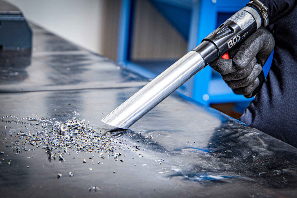 Večfunkcijska pnevmatska pištola, opcijsko za izpihovanje ali vsesavanje tujih predmetov, odrezanih ostankov ali drugih materialov, odstranjevanje tujih predmetov ali drugih materialov na težko dostopnih mestih, primerno za avtomobilsko ali montažno delo, v modelarstvu, v delavnici, kovinsko ohišje, enostavna nastavitev s krmilnim kolesom med sesalno in pihalno funkcijo, ojačana zbirna vreča preprečuje poškodbe vreče od ostrih odrezanih ostankov, z petimi praktičnimi podaljški in šobami, ki jih je mogoče pritrditi na pištolo glede na uporabo, sesalna moč: 11,8 cmHg, dolžina pištole: 147 mm, 1 zračna pištola za pihanje in sesanje (kovinsko ohišje), 1 prilagodljiv teleskopski cev, 325 mm, 1 cevna priloga, ravna, 1 cevna priloga, nagibna, 1 okrogla šoba, 1 šoba s čopičem, 1 zbirna vreča, 1 pritrdilna objemka