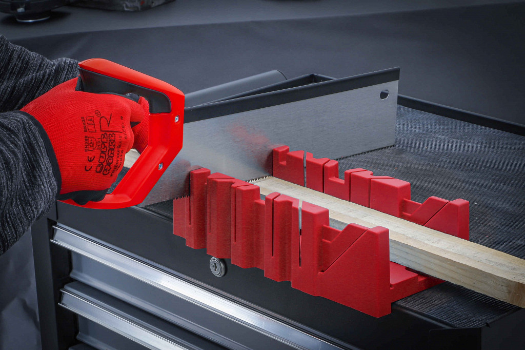 Komplet za mizarje in krovce, žaga dolžine 350 mm iz manganovega jekla, 12 zob na palec, kotnik za rezanje pod 22,5°, 45° in 90°, zaboji iz ABS plastike