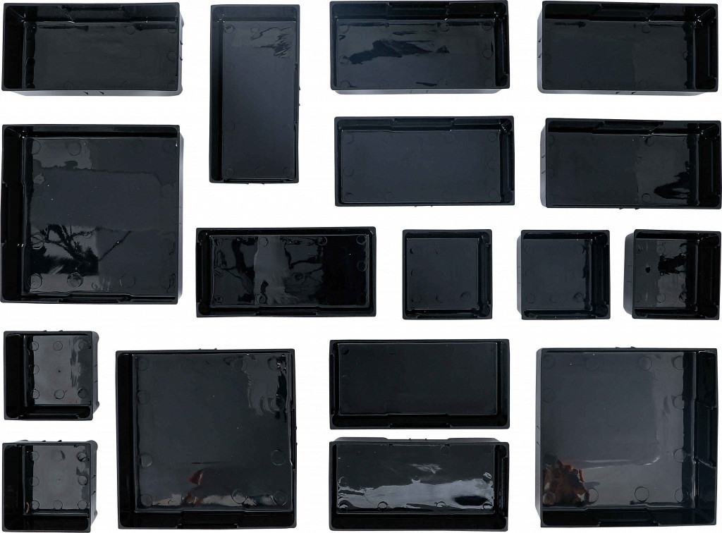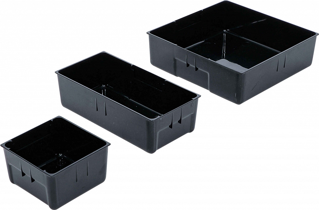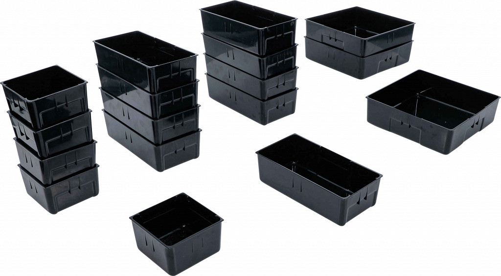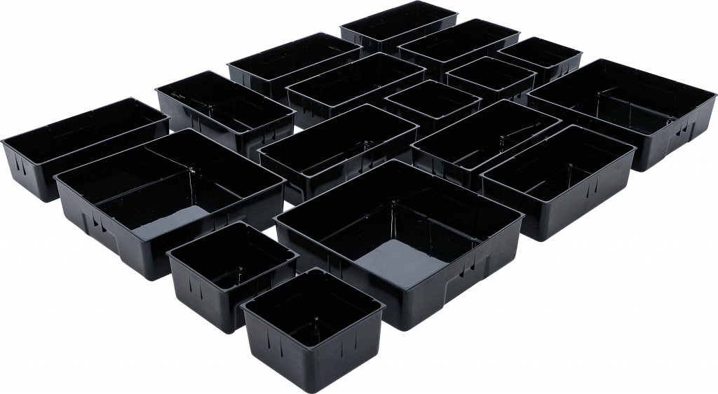 Plastični organizator za vse BGS vozičke, primeren za vijake, objemke in drobne dele, različne velikosti pladnjev, enostavno nameščanje v predal. Vsebina: 5 pladnjev 70 x 70 x 45 mm, 9 pladnjev 145 x 70 x 45 mm, 3 pladnji 145 x 145 x 45 mm.