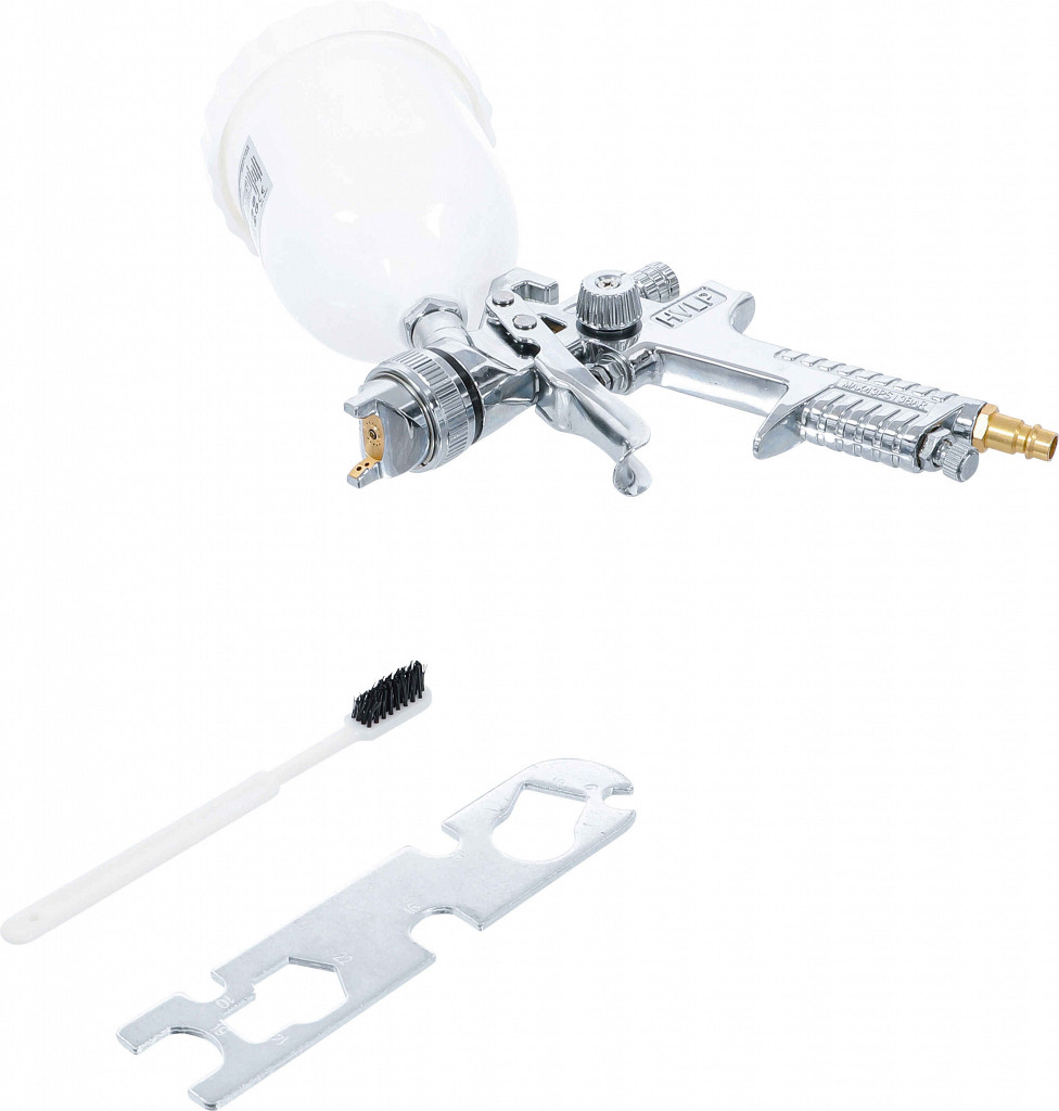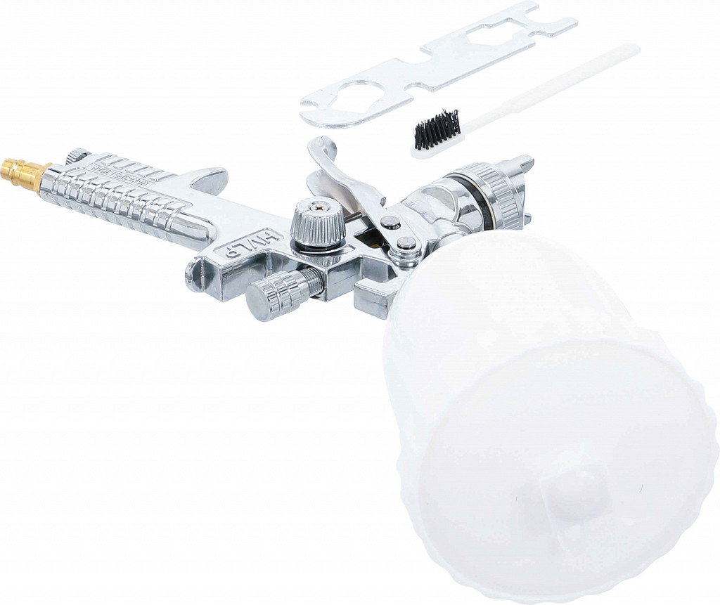 Razpršilni ventil 1,5 mm. Univerzalna glava: okrogla, široka, ploščata. Poraba zraka: pri 3 barih pretok 120 l/min, pri 5 barih pretok 200 l/min.