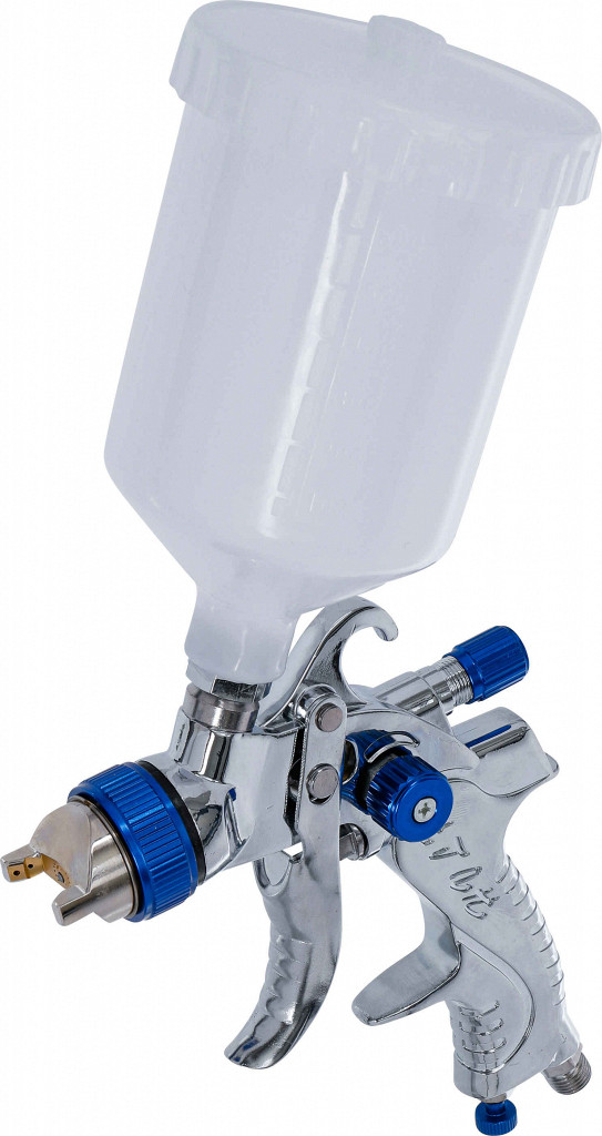 HVLP lakirna pištola za majhne površine in težko dostopna mesta, z nastavitvijo zraka in barve, 30 % manjša poraba materiala, šobe iz nerjavečega jekla velikosti 1,4–2,0 mm, priložen plastičen lonček 600 ml, komplet šob, krtača in ključ.