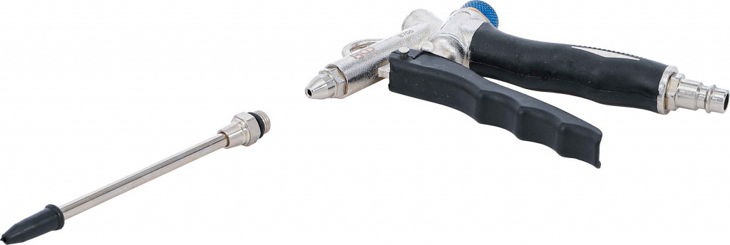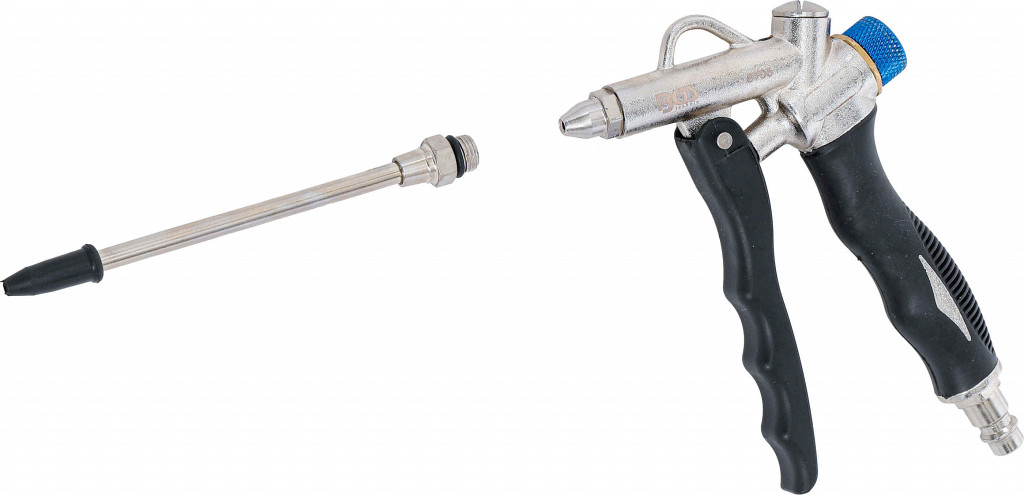 Nastavljiv pretok zraka, 110 mm šoba z možnostjo uporabe plastične zaščite proti praskam, aluminijeva zlitina, dovod zraka se lahko priključi na ročaj ali na vrh pištole, nedrseč ročaj, vključen 6.3 mm (1/4") zračni priključek.