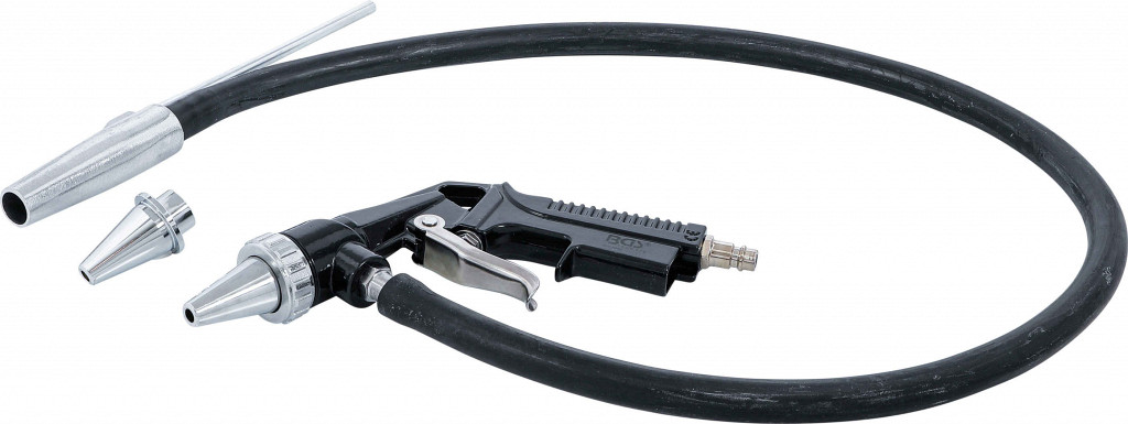 Pnevmatska pihalna pištola z gumijasto cevjo dolžine 100 cm, notranjim Ø 10,5 mm, šobo Ø 6 mm in nadomestno šobo, delovni tlak 6–8 bar, poraba zraka 425 l/min, raven hrupa 90 dB(A).