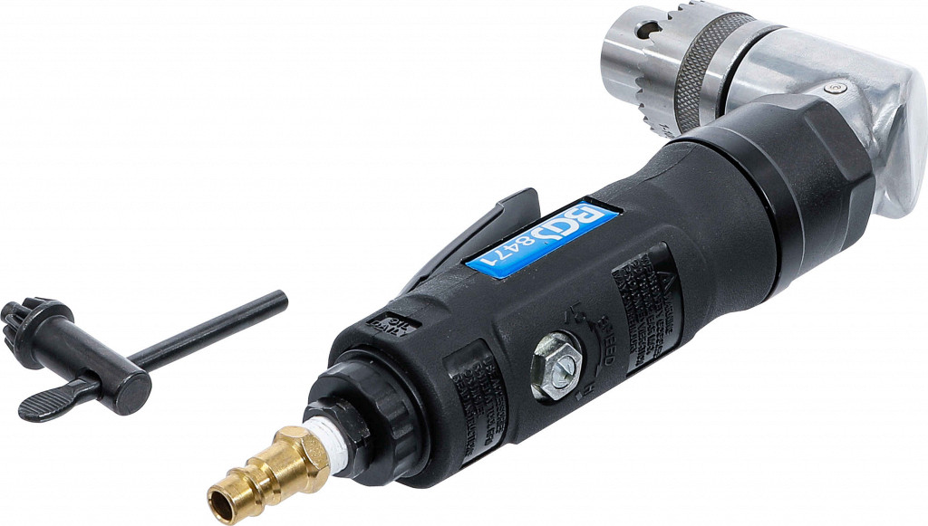 Pnevmatski vrtalnik za ozke prostore, idealen za vrtanje zlomljenih vijakov na motorjih, s 10 mm vpenjalno glavo, prostim tekom 1800 rpm, delovnim tlakom 6,2 bara, porabo zraka 105 l/min in priklopom 6,3 mm (1/4").