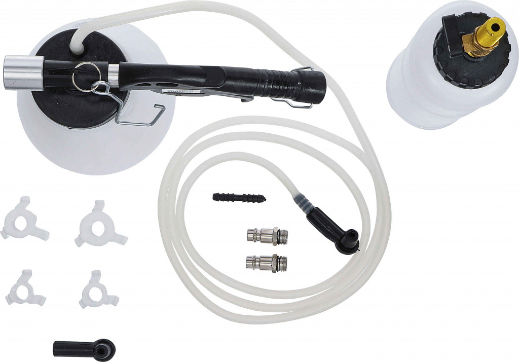 za menjavo zavorne tekočine in odzračevanje zavornih in sklopčnih sistemov; omogoča hitro in učinkovito delo z enostavno enosebno uporabo; prostornina posode: 1 l; priključek za cev: 6,3 mm (1/4") hitra spojka; komplet vsebuje: pištolo za odzračevanje, 4 adapterje za ekspanzijsko posodo, 1 nastavek za stisnjen zrak, 2 adapterja za odzračevanje, 1 prozorno cev, 1 stekleničko za dolivanje, ki olajša postopek odzračevanja