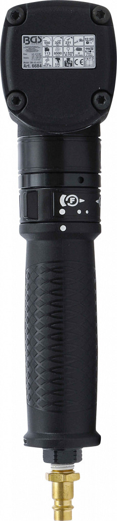 Velikost profila pogona, palec: 1/2 "; Velikost profila pogona, metrična: 12,5 mm; Delovni tlak: 6,3 bar; Bruto teža: 1336 g; navor: 325 Nm; Min. navor: 27 Nm; Priključitev stisnjenega zraka: 1/4 "; Vrtilni hod v prostem teku: 8500 vrt / min; moment rahljanja: 550 Nm; Poraba zraka: 113 l/min; najvišja raven zvočnega tlaka: 87,9 dB(A); raven zvočne moči: LwA 98,9 dB(A)