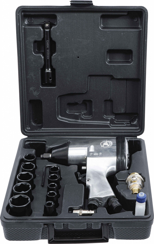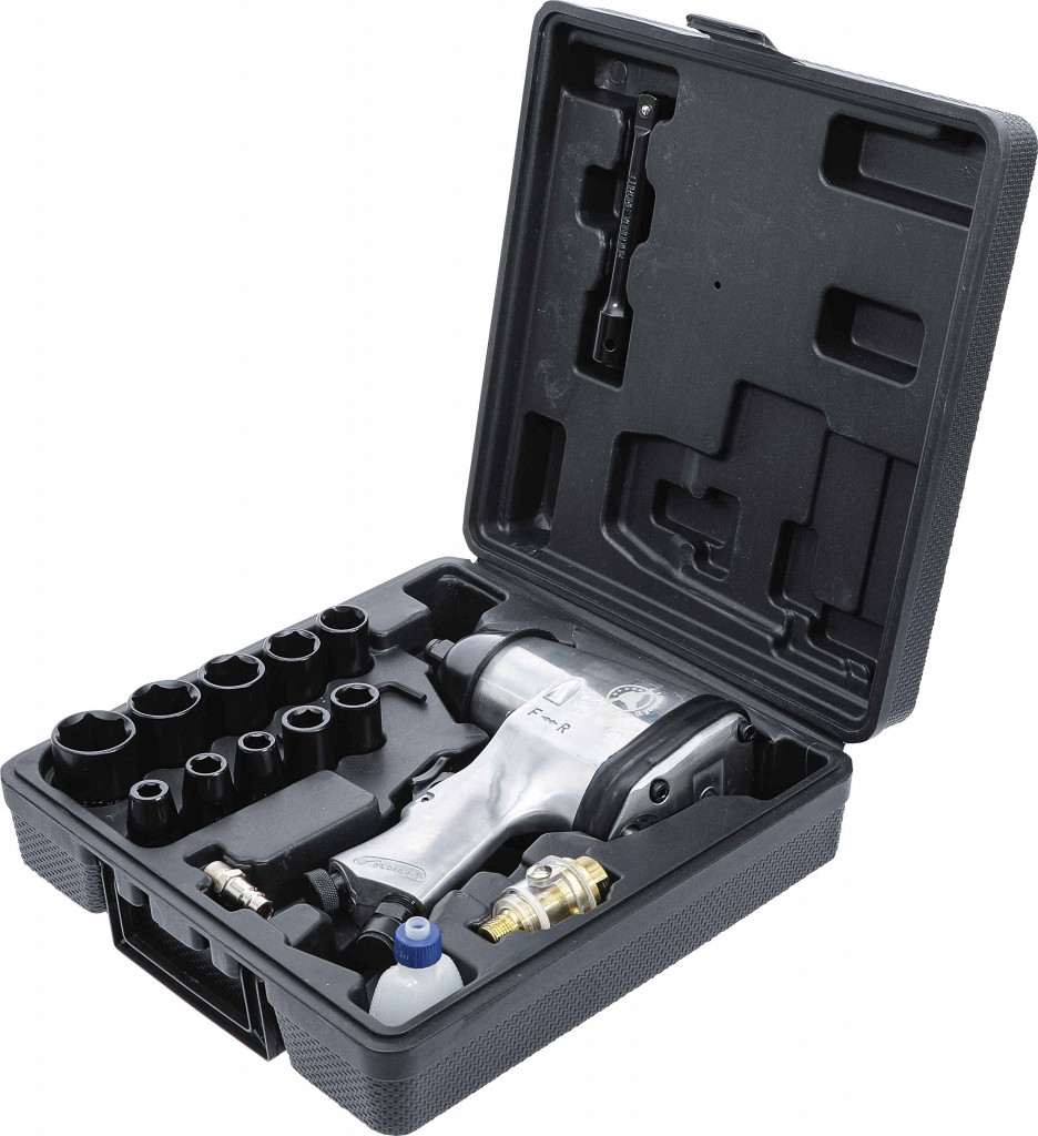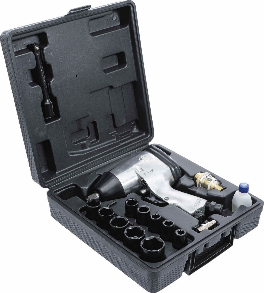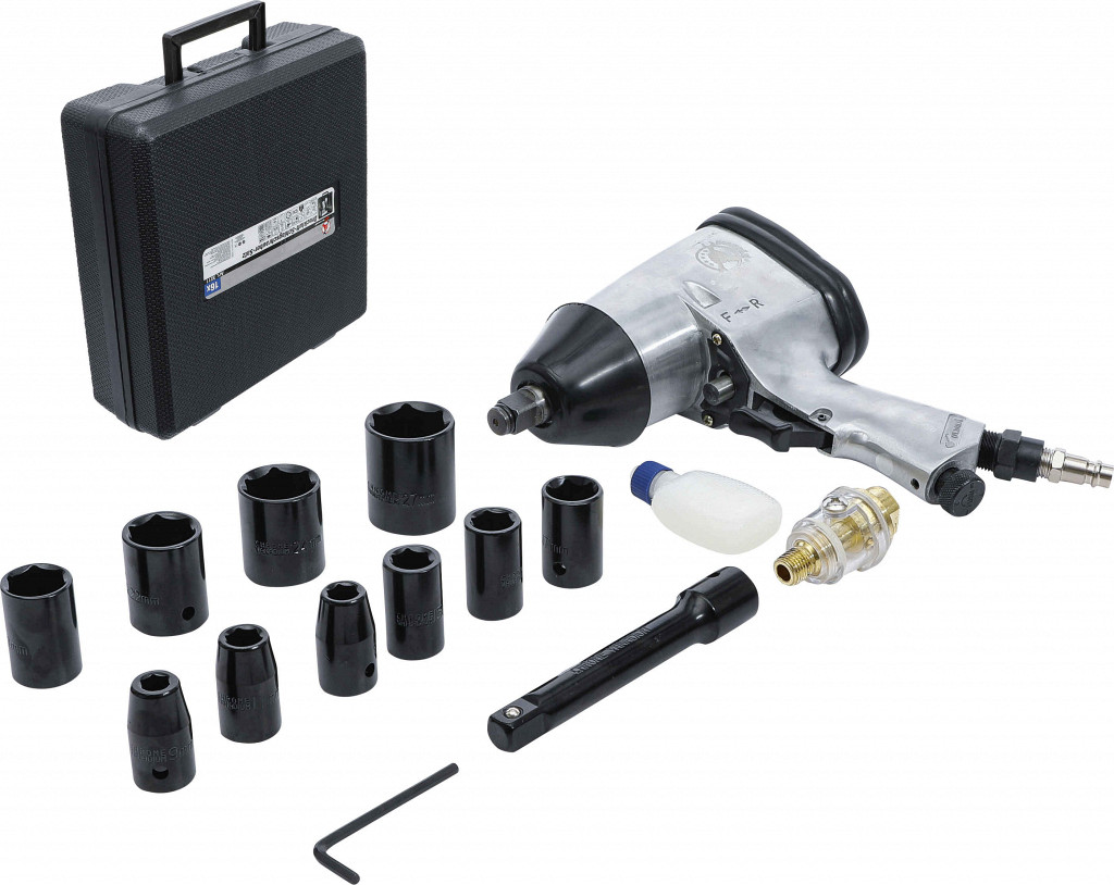 Za hobi uporabo. Obseg dobave: udarni vijačnik, zunanji kvadrat 12,5 mm (1/2"), reverzibilen desno/levo. Hitri priključek za spojko. Posodica za olje. Podaljšek zunaj/znotraj kvadrat 12,5 mm (1/2") x 125 mm. Udarne vtičnice, pogon 12,5 mm (1/2"), šesterokotne 9 - 10 - 11 - 13 - 14 - 17 - 19 - 22 - 24 - 27 mm.