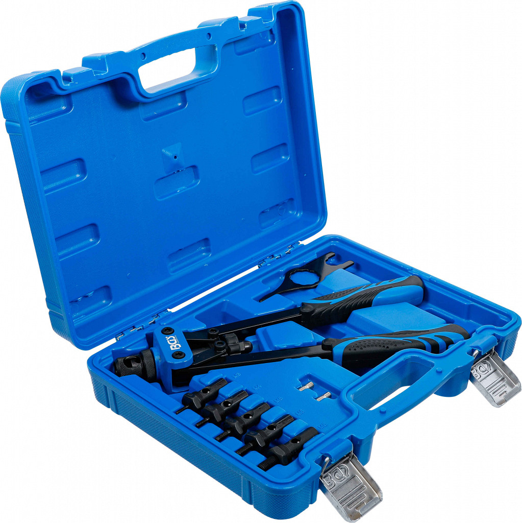 Klešče za vijačne matice M3–M8, z dvema ročicama in ergonomskimi ročaji; v kompletu nastavki za izvrtine Ø 5,0–11,0 mm in ključ za montažo.